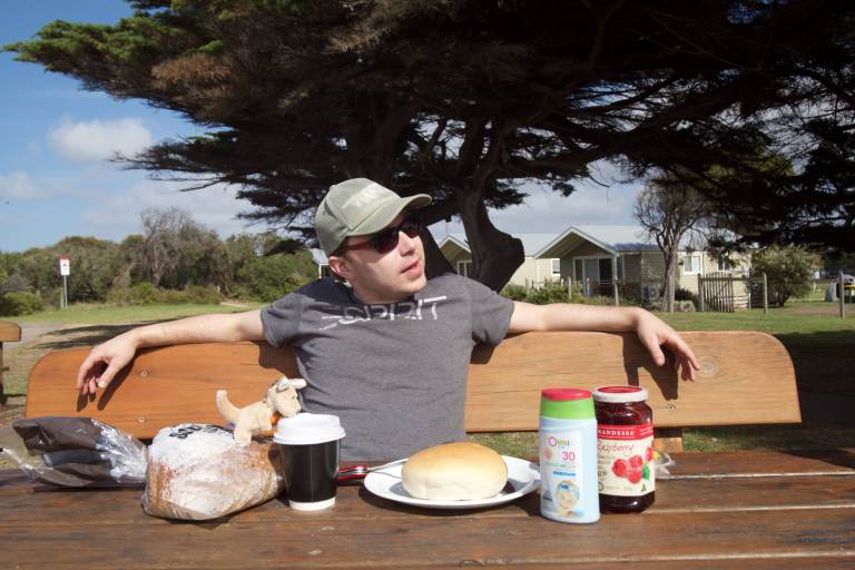 Nachdem wir unseren süßen Camper abgeholt hatten (ja, die Modellbezeichnung „Hippie Budget“ macht seinem Namen alle Ehre, aber wir haben ihn trotzdem schon ins Herz geschlossen ;-)) fuhren wir erstmal 120km raus aus Melbourne nach Queenscliff, wo wir unsere erste Nacht auf einem kleinen versteckten Parkplatz mit Meerblick verbrachten. Am nächsten Tag wurden bei wunderschönem Sonnenschein und angenehmen 25 Grad mit leichter Brise erstmal ein paar Erledigungen gemacht (Flo und Simona mit Sonnenhut ausgestattet, australische Simkarte besorgt, Flo zwei kurze Hosen gekauft, weil er seine vergessen hatte – ein Irrtum – wie sich 2 Tage später rausstelle, waren sie nur in den Tiefen des Backpacker-Rucksacks untergetaucht ;-)) Dann ging es weiter auf die Great Ocean Road, eine der schönsten Küstenstraßen der Welt. Und es ist wirklich wunderwunderschön. Nach unzähligen Fotostops, wunderschönen Ausblicken und dem ersten Koala am Straßenrand wollten Simona und Flo an diesem Abend auf einem Campingplatz übernachten, um nach der langen Reise mal duschen zu können. War leider nicht so einfach, da die Australier ein langes Wochenende hatten (am 26.1. war Australia Day), sodass alle Campingplätze ausgebucht waren. Naja, dachten die beiden, dann einfach Auto parken, Duschsachen in den Rucksack, auf den Campingplatz spazieren und schwarz duschen. War nicht ganz so einfach, da man auf australischen Campingplätzen für die Sanitäranlagen einen Schlüssel braucht. Ganz schön schlau. Aber nicht schlau genug für die beiden. Einfach davor stellen, warten bis jemand kommt und reingehen. War dann doch ziemlich einfach. Frisch geduscht suchten wir uns dann einen schönen Platz zum Schlafen – diesmal mit Flussblick und einige meiner Artgenossen in der Ferne. Am nächsten Morgen ging es weiter die Great Ocean Road entlang mit einem Abstecher in den Regenwald und zum Cape Otway Lighthouse – der Weg dorthin ist bekannt dafür, dass häufig Koalas am Wegesrand auf den Bäumen sitzen. So war es dann auch und wir konnten kaum aufhören, die putzigen Tiere zu beobachten. Unser Schlafplatz an diesem Abend sollte ein kleines Waldstück sein, nichtsahnend dass wir diesen Platz mit ungefähr tausend Stechmücken teilen mussten. Ich bin noch weitgehend verschont geblieben, aber Flo und Simona wurden trotz Mückencreme der netten Franzosen nebenann gnadenlos attackiert.