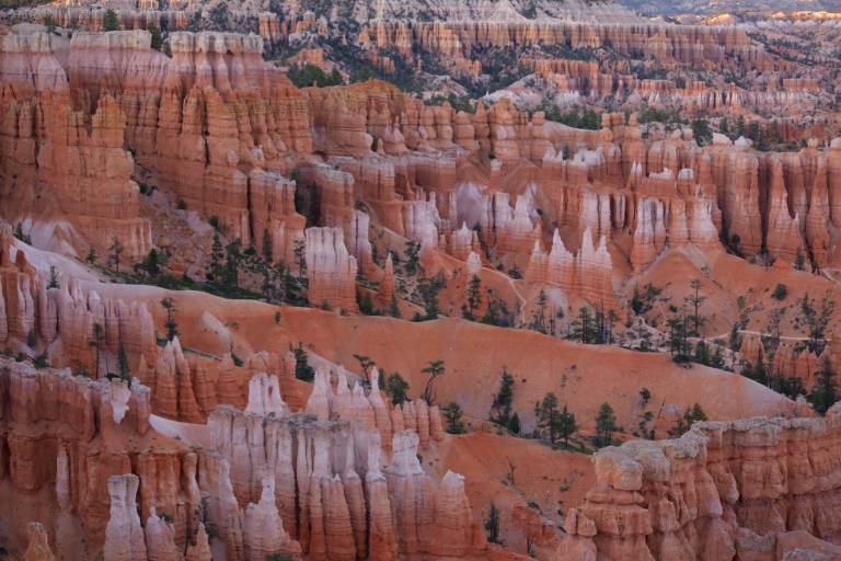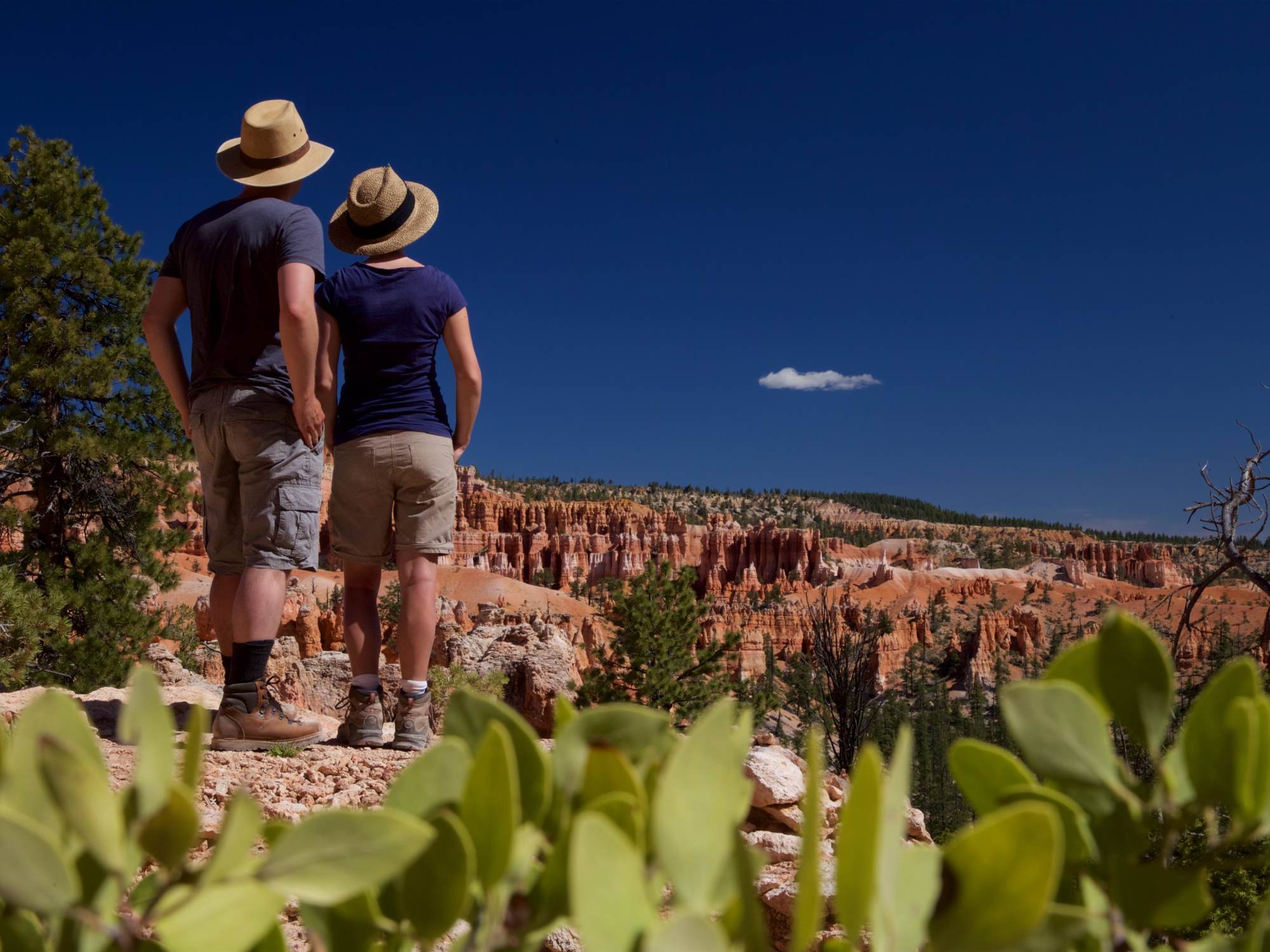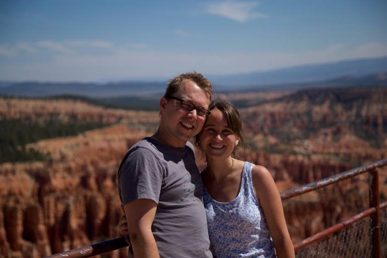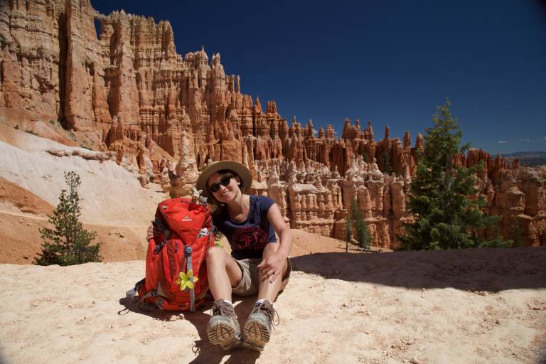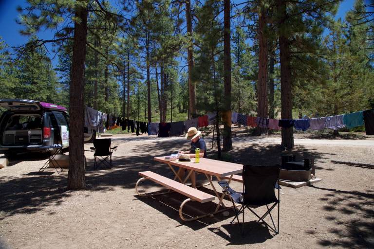 Die nächste Etappe unserer Reise führt uns zum Bryce Canyon Nationalpark, ca. 120km vom Zion Nationalpark entfernt. Da viele Nationalparkcampingplätze nach dem Prinzip „First come, first served“ (also wer zuerst kommt, bekommt den Platz) funktionieren, ist es bei den bekannten Nationalparks vorteilhaft, früh im Park zu sein, um „sein Handtuch auf die Liege zu legen“. Deshalb fahren wir nach unserer Wanderung im Zion Nationalpark noch am selben Abend in Richtung Bryce Canyon und übernachten ca. 50km vor dem Parkeingang in einem der vielen „National forests“. Das nennt sich in Amerika „Dispersed camping“ und ist erlaubtes Wildcampen, sofern man sich in einem „National-Wald“ mindestens 400m von der nächsten größeren Straße entfernt befindet. Bisher haben wir das – neben dem Nationalparkcamping- schon öferts gemacht, da die kommerziellen Campingplätze hier meist unheimlich hässlich sind. Es handelt sich oft um eine Art Wohnmobilparkplatz neben dem Highway ohne ein Fleckchen grün. Und das für jede Menge Geld. Zum Glück mussten wir diese sogenannten „RV Parks“ bis auf San Fransisco bisher nie nutzen. Am nächsten Morgen machen wir uns also früh auf den Weg in den Bryce Canyon und ergattern einen Platz auf dem „Sunset Campground“. Dort gibt es zwar keine Dusche, aber immerhin richtige Toiletten und fließendes (sogar heißes!) Wasser. Der Bryce Canyon Nationalpark liegt auf um 2200-2400m Höhe und das Klima ist im Vergleich zu den vorherigen Tagen mit ca. 25 Grad und Sonnenschein sehr angenehm. Am ersten Tag ist Waschen und entspannen angesagt. Unsere nasse Wäsche hängen wir an einer Schnur zwischen zwei Bäumen auf. Das ist verboten, wie der Ranger uns erklärt, weil das die Bäume kaputt macht. Zum Glück ist die Wäsche zu diesem Zeitpunkt schon trocken. Hängematten für 200kg schwere Amerikaner zwischen den Bäumen aufzugängen ist aber erlaubt – muss man nicht verstehen, aber ok. Abends schauen wir uns den Sonnenuntergang über dem Canyon an. Die Sandsteinsäulen leuchten dabei wunderschön rot. Am nächsten Tag geht es früh los zu einer langen Wanderung mitten durch die wunderschönen Säulen des Bryce Canyon. Sehr beendruckend, aber durch das viele auf und ab auch sehr anstrengend. Simona und Flo suchen sich mal wieder die größte Runde aus. Unterwegs sehen wir immer wieder „Chip Monkeys“, eine Art Wüstenspringmaus. Simona kriegt sich kaum wieder ein, weil die Tiere so süß sind. Hoffentlich findet sie sie nicht noch süßer als Kängurus. Am nächsten Morgen müssen wir uns schweren Herzens von diesem wunderschönen Nationalpark verabschieden. Der Bryce Canyon ist auf jeden Fall eines der Highlights bisher.