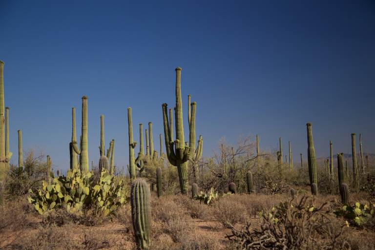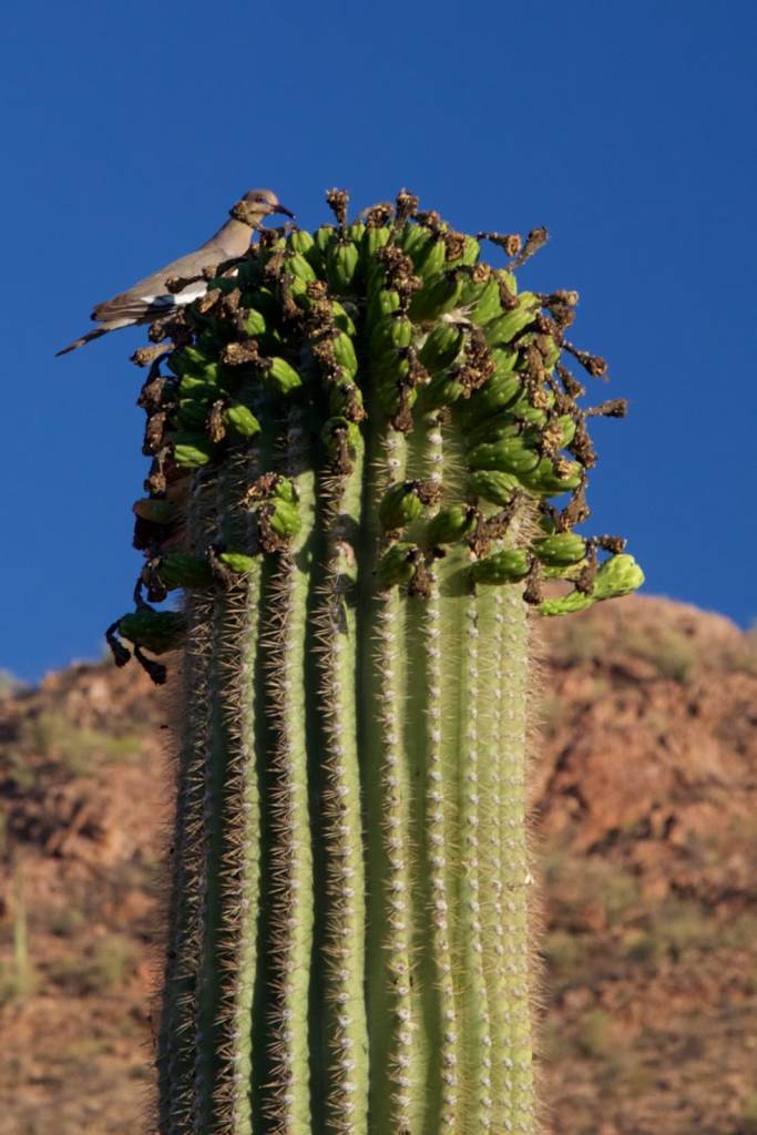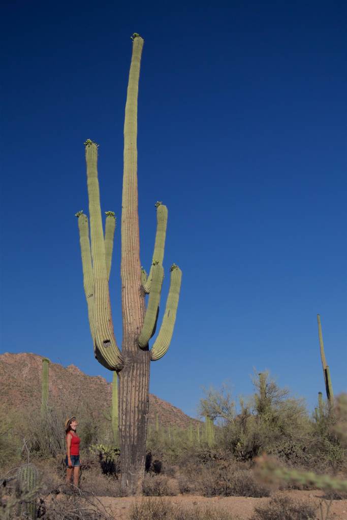 Die Geschichte beginnt mit einer Dokumentation über den Saguaro Nationalpark in der Sonorawüste im Südwesten Arizonas (kurz vor der Grenze zu Mexiko) einige Monate vor unserer Abreise. Schon damals ist Simona von den Tier- und Pflanzenarten (unter anderem dem Saguaro, der Armleuchterkaktee) in diesem Park fasziniert. Doch eigentlich ist der Park zu weit abseits von unserer Reiseroute. Dann lesen wir im Reiseführer, dass man Saguaros nur in der Sonorawüste findet und diese Ende Mai/Anfang Juni anfangen, zu blühen. Jetzt ist auch Flo angesteckt. Durch die fehlende Wanderung in den Grand Canyon haben wir zudem einen Tag „übrig“, sodass wir quasi gar nicht anders können, als doch den Umweg auf uns zu nehmen und den Saguaro-Nationalpark zu besuchen. Nicht nur den Umweg, sondern auch eine Temperatur von 115 Fahrenheit (das sind 46 Grad Celsius) im Schatten nehmen wir dafür auf uns. Wir haben das Ganze so geplant, dass wir nach 16 Uhr im Park ankommen (in der Hoffnung, es sei dann nicht mehr so heiß – Pustekuchen, bis zur Dämmerung gegen 19 Uhr bleiben es 111 Fahrenheit, das sind ca. 44 Grad). Es ist so heiß, dass man das Spülwasser gar nicht warm machen muss, man verbrennt sich schon so die Finger. Die Mittagshitze verbringen wir im klimatisierten „Wendys“, einem Fastfoodrestaurant, und testen Pommes und Chicken Nuggets.