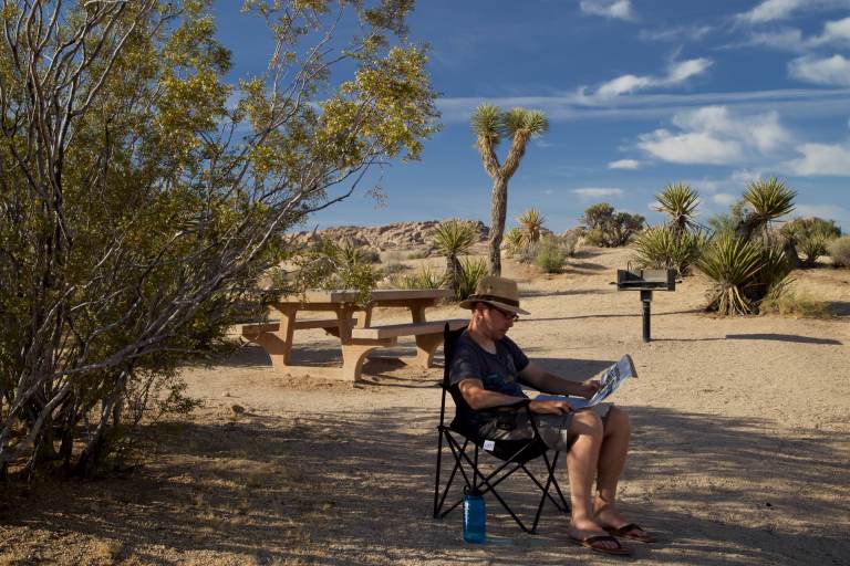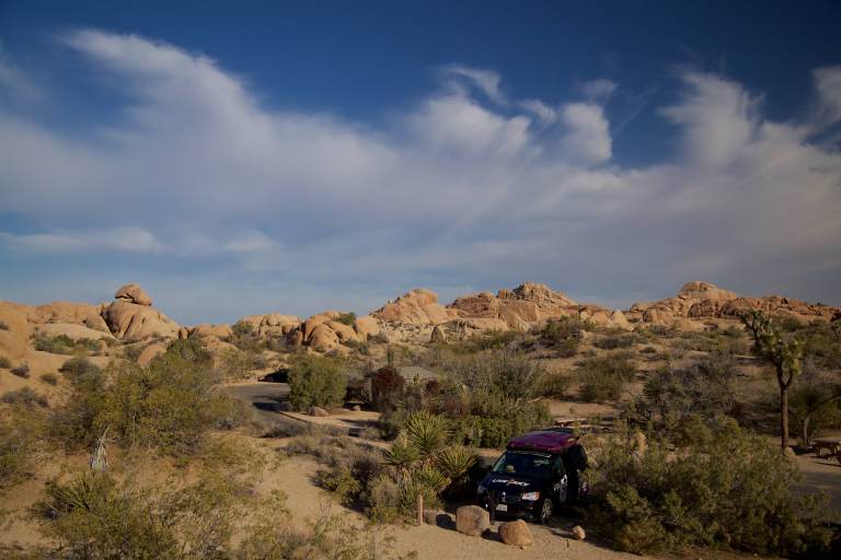 Doch die Strapazen lohnen sich. Die Saguaros sind einfach beendruckend, viel größer als erwartet. Sie erreichen eine Größe von bis zu zwölf Metern Höhe und wiegen dabei etwa 8 Tonnen. Dazu müssen sie etwa 200 Jahre alt werden. Wir sind gefühlt die einzigen Besucher Park und fahren den „Bajada scenic loop“ im Westteil des Parks. Dabei steigen wir immer wieder aus und machen Fotos. Flo stellt sich sogar auf einen Stein und nimmt Simona auf die Schultern, die wiederum mich in die Nähe einer Kaktusblüte hält, sodass ich daran schnuppern kann. Auch im Sonnenuntergang sehen die Kakteen unglaublich schön aus, auch wenn leider kein Cowboy auf seinem Pferd zur Deko durchs Bild reitet und die Kakteen gar nicht so gleichmäßig (alle gerade, jeder zwei Arme) sind, wie immer dargestellt. Zum Übernachten suchen wir uns wieder ein dispersed Camping und nutzen aufgrund der Hitze mal unser Schlafzimmer in der zweiten Etage. Das ist – wenn man möchte – bis auf ein Fliegengitter rundherum komplett offen und man kann sich nachts die kühle Wüstenluft um die Nase wehen lassen. Am nächsten Morgen stehen wir schon um sechs Uhr auf und schauen uns noch den Ostteil des Parks an. Um 10 Uhr ist es schon wieder 38 Grad heiß, sodass wir beschließen, uns auf den Rückweg Richtung Küste zu machen. Nach 500km Fahrt und einer Dusche im Travel-Stopp am Highway übernachten wir an diesem Abend auf einem Nationalparkcampingplatz zwischen Felsen, Squirrels und Joshua Trees im wunderschönen aber leider auch viel zu warmen Joshua Tree Nationalpark, bevor wir am nächsten Tag noch einmal 300km bis zur Pazifikküste bei Los Angeles fahren.