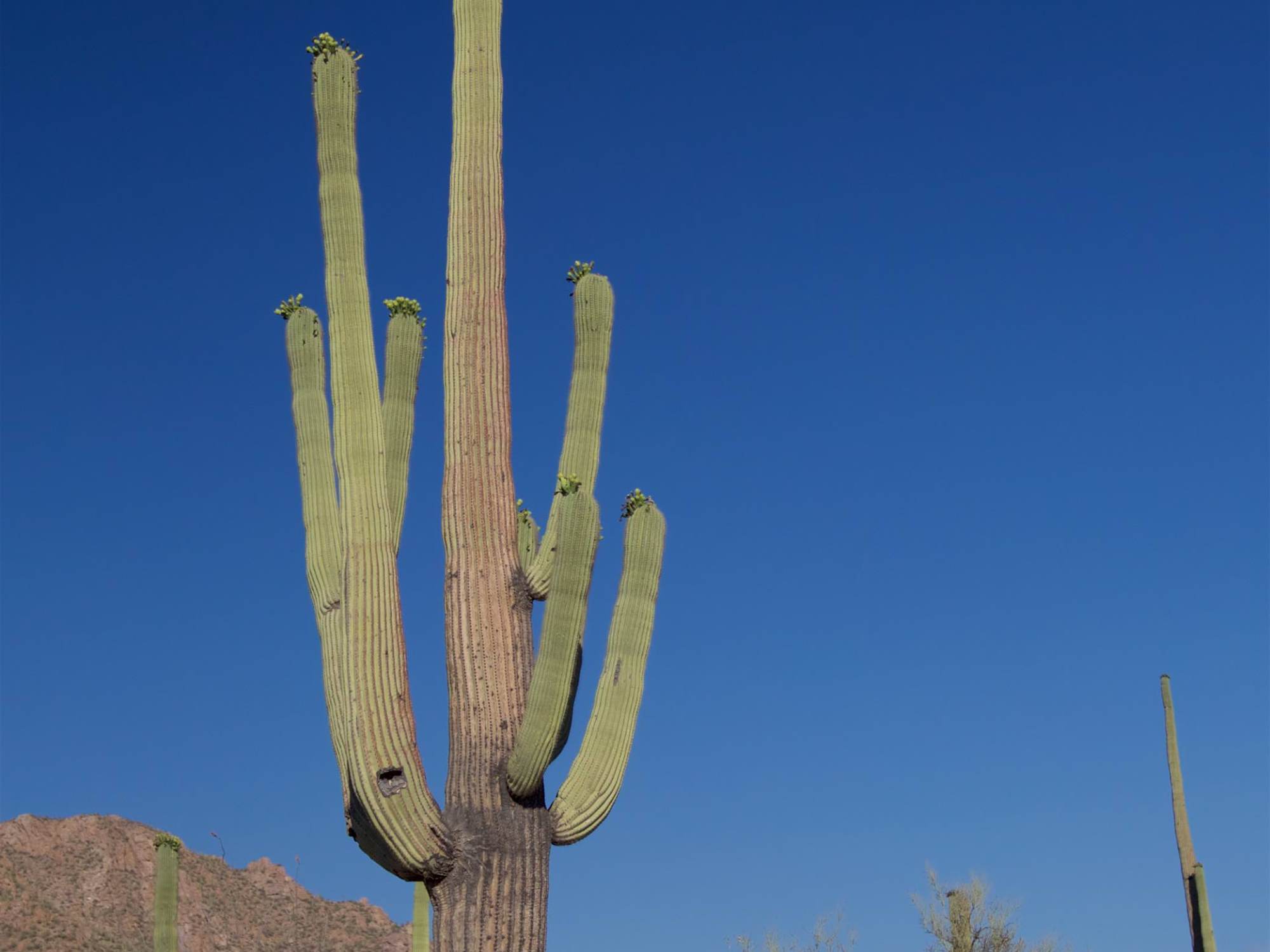 Die Geschichte beginnt mit einer Dokumentation über den Saguaro Nationalpark in der Sonorawüste im Südwesten Arizonas (kurz vor der Grenze zu Mexiko) einige Monate vor unserer Abreise. Schon damals ist Simona von den Tier- und Pflanzenarten (unter anderem dem Saguaro, der Armleuchterkaktee) in diesem Park fasziniert. Doch eigentlich ist der Park zu weit abseits von unserer Reiseroute. Dann lesen wir im Reiseführer, dass man Saguaros nur in der Sonorawüste findet und diese Ende Mai/Anfang Juni anfangen, zu blühen. Jetzt ist auch Flo angesteckt. Durch die fehlende Wanderung in den Grand Canyon haben wir zudem einen Tag „übrig“, sodass wir quasi gar nicht anders können, als doch den Umweg auf uns zu nehmen und den Saguaro-Nationalpark zu besuchen. Nicht nur den Umweg, sondern auch eine Temperatur von 115 Fahrenheit (das sind 46 Grad Celsius) im Schatten nehmen wir dafür auf uns. Wir haben das Ganze so geplant, dass wir nach 16 Uhr im Park ankommen (in der Hoffnung, es sei dann nicht mehr so heiß – Pustekuchen, bis zur Dämmerung gegen 19 Uhr bleiben es 111 Fahrenheit, das sind ca. 44 Grad). Es ist so heiß, dass man das Spülwasser gar nicht warm machen muss, man verbrennt sich schon so die Finger. Die Mittagshitze verbringen wir im klimatisierten „Wendys“, einem Fastfoodrestaurant, und testen Pommes und Chicken Nuggets.