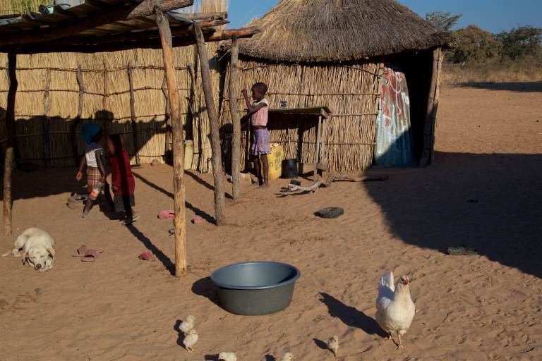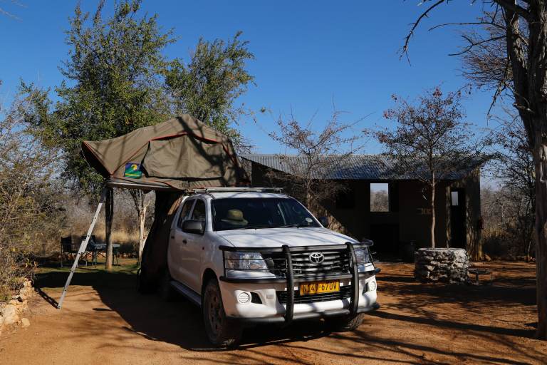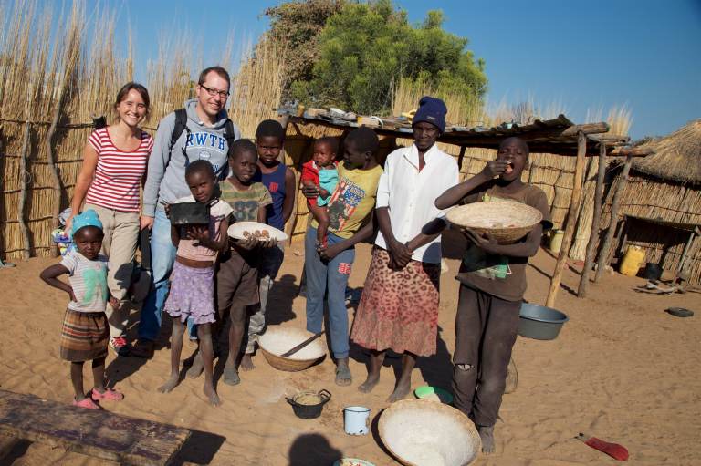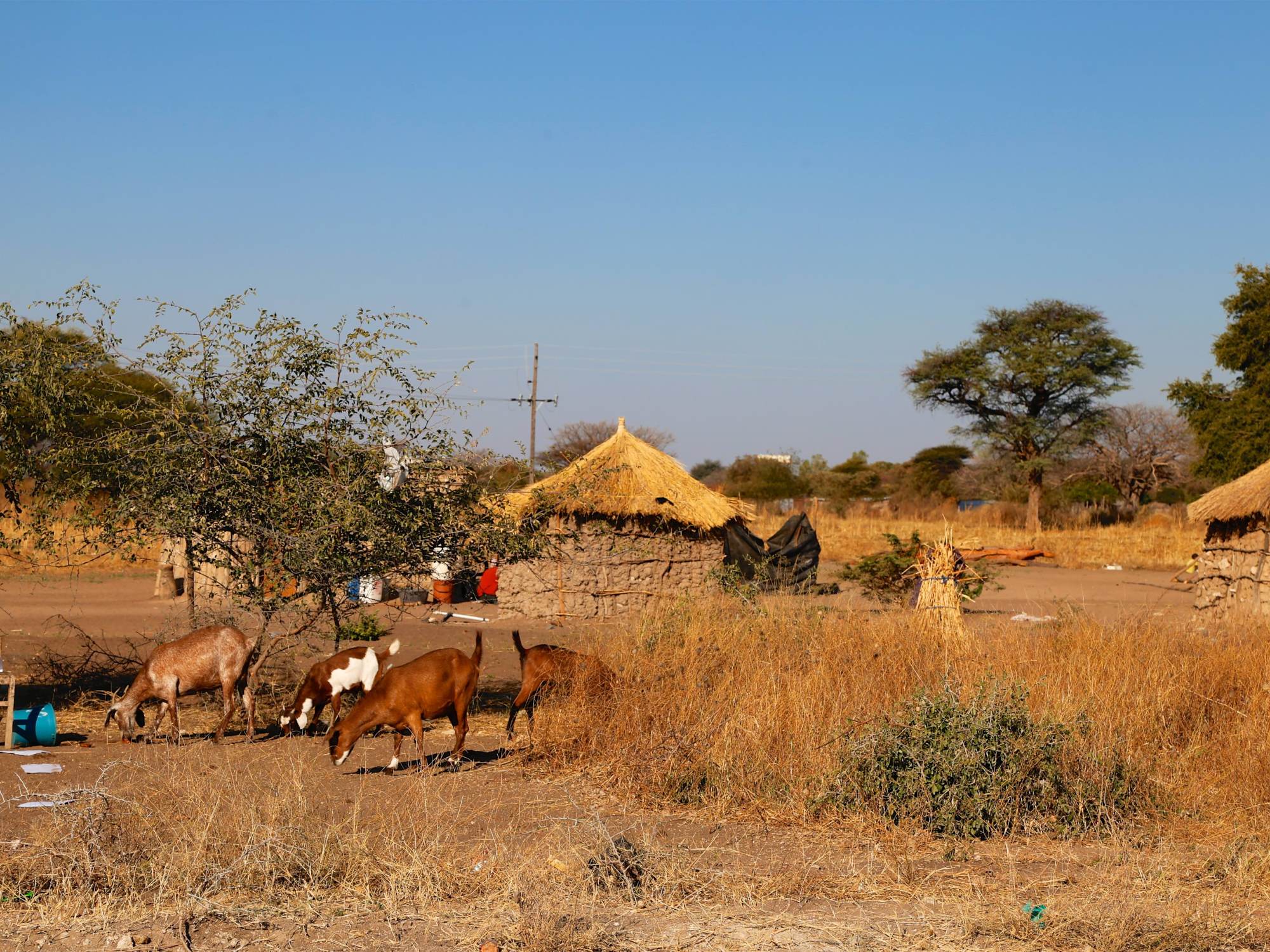 Das Tor zum Shametu River Camp trennt erneut die dritte Welt von der ersten Welt – meist leider die schwarze von der weißen Welt. Für 20 Euro bekommen wir einen großen Platz, wieder mit eigenem Küche- und Badhäuschen. Die Campingplätze haben in Namibia anscheinend immer eine gehobene Ausstattung und auf dem gleichen Gelände befindet sich immer auch eine luxuriöse Lodge. Am Fluss gibt es wieder eine super Terrasse mit Pool und Blick auf den Fluss. Diesmal sehen wir auch ein paar Nilpferde darin herumschwimmen. Wir haben einen richtig entspannten Tag. Abends gehen wir zur Feier des Urlaubs im dem Camp zugehörigen Restaurant essen. Nach dem Essen unterhalten wir uns mit der südafrikanischen Besitzerin des Camps, um ein bisschen über die Lebensumstände der Menschen hier zu erfahren. Sie beantwortet uns schon einige Fragen und schlägt uns vor, am nächsten Tag mit einer ihrer namibianischen Mitarbeiterinnen ein traditionelles kleines Dorf zu besuchen. Gesagt, getan. Am nächsten Morgen laufen wir mit ihr in eine nahe gelegene Ansammlung von Lehm- und Strohhütten, an denen wir die letzten zwei Tage schon so oft vorbeigefahren sind. Wir werden schon von ihren Verwandten erwartet. Eine Großmutter mit ihren 7 Enkeln. Wir dürfen zuschauen, wie ein traditionelles Essen aus Getreide und Nüssen zubereitet wird. Eine wahnsinnig tolle Erfahrung.