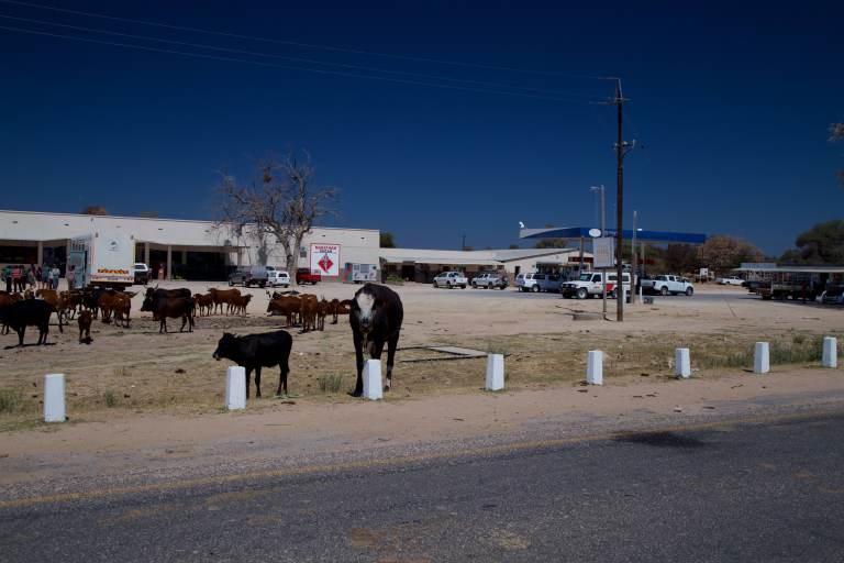 Am nächsten Tag haben wir uns nur eine kurze Etappe vorgenommen. Unser Ziel ist das Shametu River Camp in Divundu und liegt nur ca. 200km östlich von Rundu. Kaum ist das Tor des letzten Camps hinter uns geschlossen, läuft das Dritte-Welt-Programm erbarmungslos weiter. Doch diesmal sind wir ein bisschen besser darauf eingestellt. In Divundu müssen wir das erste Mal tanken. Dank unserem Safari-Deluxe-Auto mit 2 Tanks von 60+80l müssen wir sehr selten tanken. Die ersten 60km zeigt die Tanknadel einfach die ganze Zeit „full“ an, erst bei Anbruch der letzten 80l bewegt sie sich langsam nach unten. An der Tankstelle herrscht für den westlichen Geschmack ebenfalls heilloses Durcheinander. Kühe und Ziegen laufen zwischen den Zapfsäulen umher. Menschen haben einen kleinen Markt am Rand installiert. Und mittendrin 2 weiße Aliens und 3 kleine Kuscheltiere. Alle sind nett zu uns, wir sind wachsam, fühlen uns nicht unsicher.