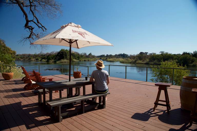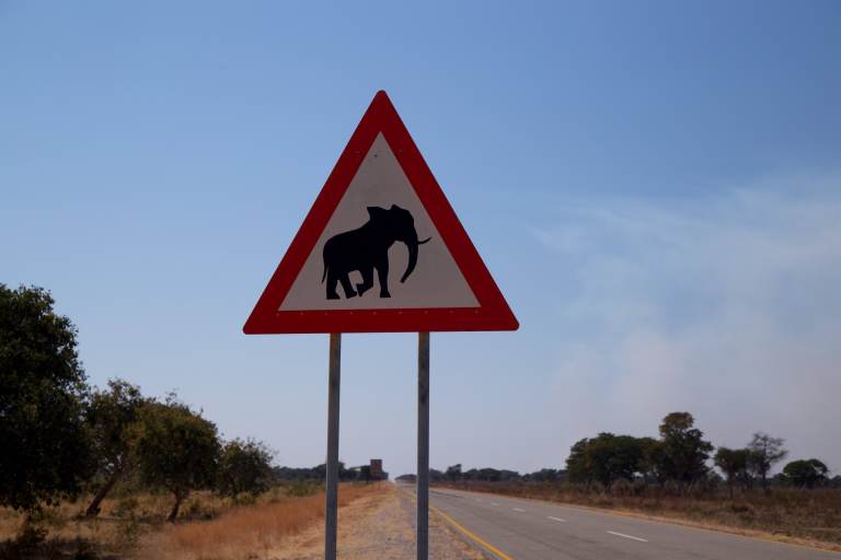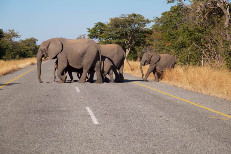 Danach müssen wir leider weiter, denn es soll nach einem kleinen Zwischenstopp in Kasane (Botswana) zunächst weiter zu den Victoriafällen in Simbabwe gehen. Während der Fahrt hören wir auch ab und an Namibia-Radio. Hier kann es schon mal vorkommen, dass die CD im Radio spingt und ein Lied weiter gedrückt wird :-D. Die Einreise in Botswana ist etwas abenteuerlich. Wir müssen mit unseren Schuhen auf mit Desinfektionsmittel getränkten Lappen herumtreten. Zudem müssen wir unsere Paprika und unsere Avocado abgeben, was wiederum auf einem Formular für Paprika und einem Formular für Avocado vermerkt und von uns unterschrieben werden muss. Das Ganze soll verhindern, dass sich die Maul- und Klauenseuche ausbreitet. Dass wir noch weitere „verbotene“ Lebensmittel im Kühlschrank haben, interessiert den Beamten nicht, scheinbar ist er mit den zwei Sachen, die er gefunden hat, zufrieden. Kaum sind wir 5 Meter durch Botswana gefahren, laufen schon die ersten Elefanten über die Straße. Traumhaft. Leider haben wir in Kasane kein Camp vorgebucht und es scheint alles ausgebucht zu sein. Mit etwas Charme kann Flo doch noch ein kleines Plätzchen für uns am Fluss ergattern. O-Ton der Dame an der Rezeption: Auf Platz 17 passt noch nicht mal ein Fahrrad, aber Sie dürfen sich den Platz gerne anschauen. Natürlich ist der Platz groß genug für unser Auto inklusive Dachzelt. Im Sonnenuntergang versammelt sich eine riesige Elefantenherde am gegenüberliegenden Flussufer. Botswana hat schon unser Herz erobert. Doch morgen fahren wir erst einmal zu den Victoriafällen nach Simbabwe, bevor wir in zwei Tagen wieder nach Botswama zurückkehren.