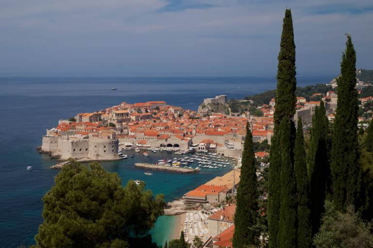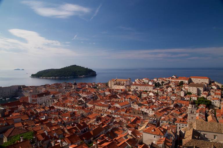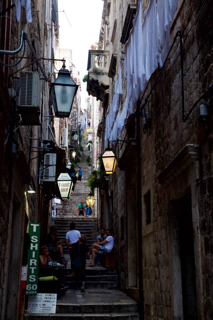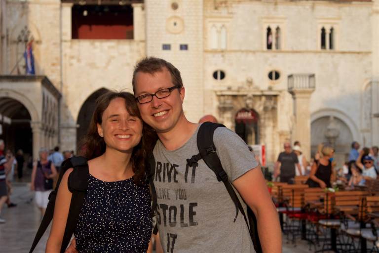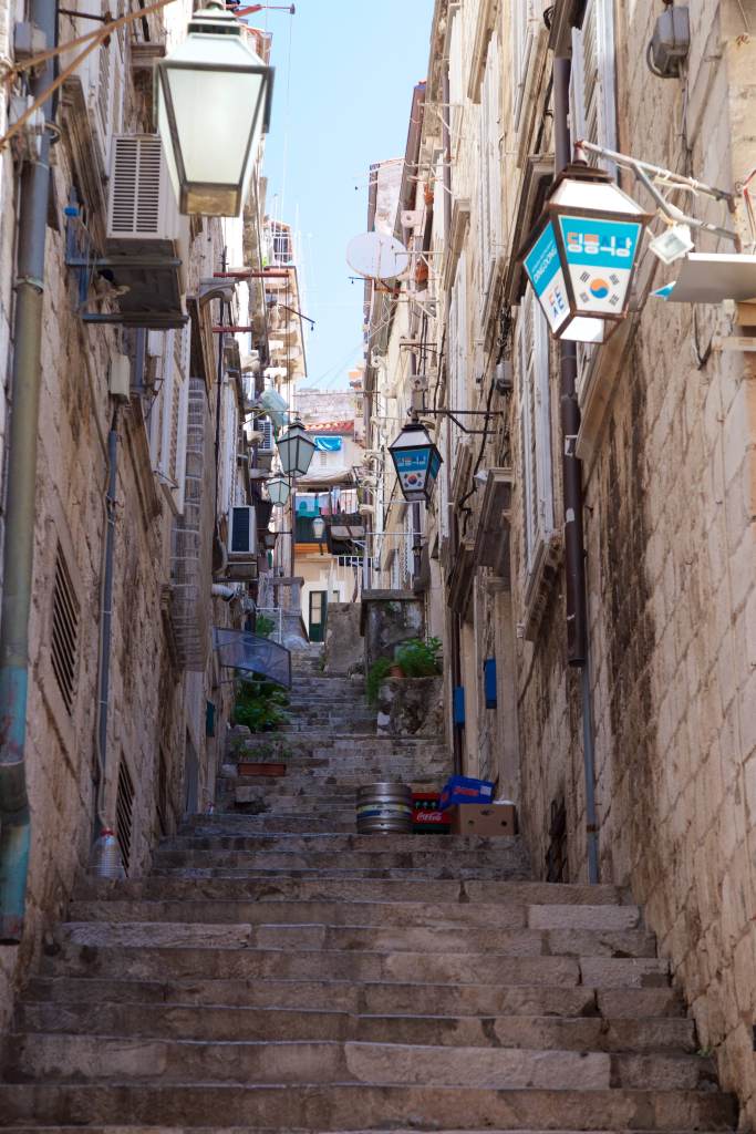 Nachdem wir jede Kurve der „Adria magistrale“, also der kroatischen Küstenstraße, mitgenommen haben, landen wir ungefähr 800km nach unserer Ankunft in Kroatien in Dubrovnik. Wir entscheiden uns für einen Campingplatz etwas außerhalb der Stadt, sodass wir wieder mit dem Fahrrad in die Stadt radeln können. Wider erwarten ist der Campingplatz wunderschön ruhig auf einem Hügel gelegen und bietet viel Schatten durch Bäume. Das kann man in der dalmatinischen Hitze auch gebrauchen (obwohl es erst Mai ist, klettert das Thermometer jeden Tag bis auf über 30 Grad). Wir nutzen zuerst die Dusche und entspannen eine Runde im Schatten, dann schwingen wir uns auf’s Fahrrad und fahren ca. 6km in die Altstadt von Dubrovnik. Dubrovnik ist ähnlich hügelig wie Aachen, was die Einwohner aber im Gegensatz zu Aachen offensichlich davon abhält, das Fahrrad zu benutzen. Es mag auch am Fahrstil der restlichen Verkehrsteilnehmer sowie an den fehlenden Fahrradwegen liegen. Auf jeden Fall sind wir die einzigen Fahrradfahrer weit und breit. Um das Ganze einigermaßen unbeschadet zu überstehen, ziehen wir einen Helm an und fahren ausschließlich auf dem Bürgersteig. Wir kommen tatsächlich heil in der Stadt an. Wir schauen uns Dubrovnik von einem Wohngebiet über der Stadt aus von oben an und finden tatsächlich exakt die Stelle , an der das Titelbild des „Lonely Planet Kroatien“ gemacht wurde (die Zypressen sind mittlerweile etwas gewachsen ;-)). Simona findet einige hundert Meter auf einem Feldweg natürlich noch eine schönere Stelle. 🙂 Nachdem wir uns fotografisch ausgetobt haben, laufen wir in die Altstadt. Die Sonne ist mittlerweile untergegangen und es ist leicht dämmrig. Wir haben das Gefühl, wir haben uns mit dem Durchschritt des Pile-Tors in der Stadtmauer in eine Zeitreisemaschine gesetzt. Selten sind wir an so einem mystischen und zauberhaften Ort gewesen. Es hätte uns nicht gewundert, wenn Harry Potter mit seinem Nimbus 2000 plötzlich um die Ecke geflogen wäre. Die Stimmung in dieser Stadt innerhalb der Stadtmauern ist kaum in Worte oder Bilder zu fassen. Wir bummeln noch eine Weile über das spiegelglatte und blitzblank geputze Marmorpflaster durch die Gassen, bevor wir uns noch ein leckeres Abendessen gönnen. Wir sind so begeistert, dass wir beschließen, unsere Zeitreise etwas auszudehnen und noch einen weiteren Tag in Dubrovnik zu bleiben.