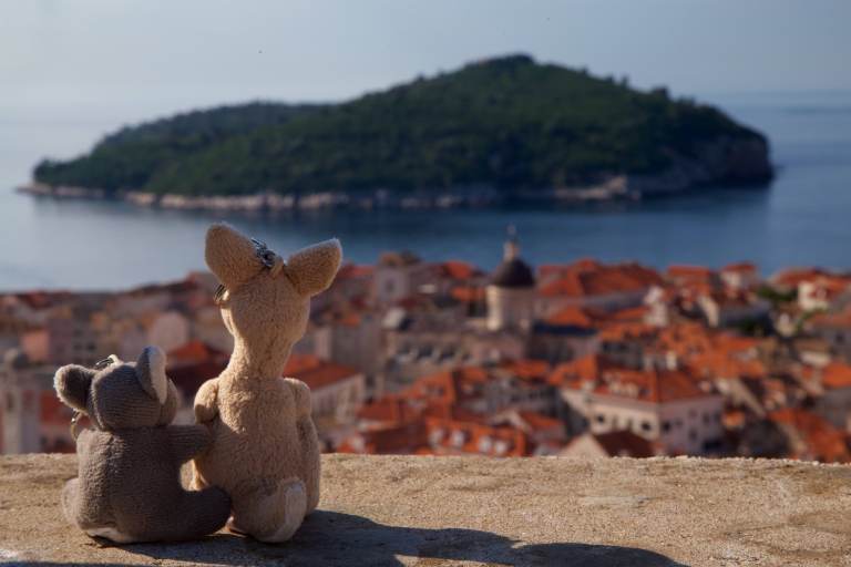 Am nächsten Morgen stehen wir früh auf, um in der Stadt zu sein, bevor die Kreuzfahrtouristen einfallen (was wir zu diesem Zeitpunkt noch nicht wissen: exakt an diesem Tag wird nur ein sehr kleines Schiff am Hafen anlegen). Wir machen einen 2km langen Rundgang über die komplette Stadtmauer, von wo aus man einen wundervollen Blick über die Altstadt und die Adria hat. Es gibt nur 3 Eingänge, an denen man die Mauer betreten kann. An jeder der vier Ecken thront eine mehr oder weniger große Festung. Zudem darf die nur 1m breite Stadtmauer nur gegen den Uhrzeigersinn „belaufen“ werden, damit es keine Zusammenstöße mit Selfiestickkonzentrierten Asiaten gibt. Auch ohne Kreuzfahrttouristen sind auch in früher Stunde schon einige Leute unterwegs. Wenn wir jetzt kurz in die entgegengesetzte Richtung abbiegen würden, wären wir die einzigen und ersten auf der ersten und höchsten Festung….Bonnie und Clyde schauen sich kurz an. Die Sache ist klar. Und der Moment zu zweit mit dem Blick über die terakottafarbenen Dächer Dubrovniks und die in der Morgensonne blau glitzernde Adria einmalig. Nach der Stadtmauer-Tour gönnen wir uns ein leckeres Frühstück und beobachten im Schatten des Hafens den Schiffsverkehr. Übrigens lesen wir bei Wikipedia, dass Clyde aufgrund eines abgehackten Zehs nur barfuß Autofahren konnte. Lustigerweise fährt Flo auf unseren Reisen immer barfuß, da er mit Flipflops nicht Auto fahren kann. Alle Zehen sind aber noch dran 🙂