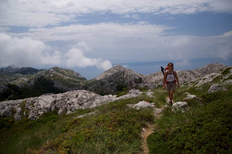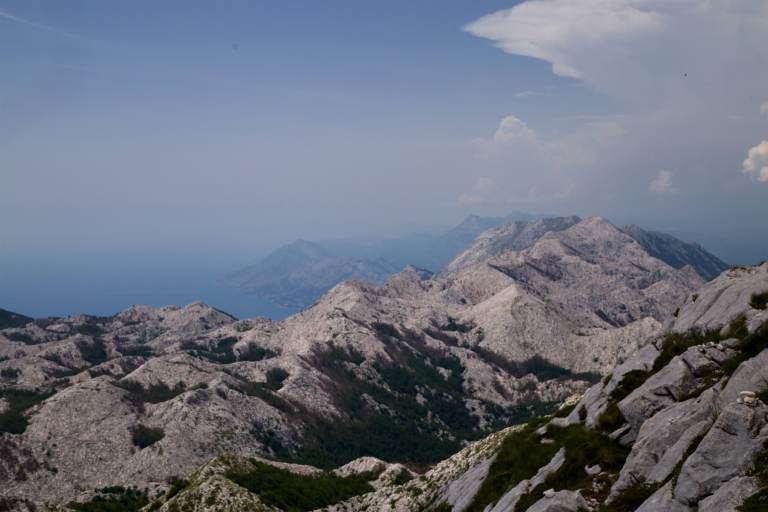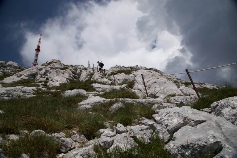 Am nächsten Morgen stehen wir um 7 Uhr auf und fahren hoch zu unserem Startpunkt. Der Herr am Eingang des Nationalparks (diesmal ein anderer als gestern) möchte uns nicht reinlassen mit der Begründung, die Straße auf den Berg sei für Wohnmobile verboten, weil zu eng. Wir könnten alternativ den Bus nehmen (netter Versuch, der Bus ist noch breiter, höher und länger als Hugo) oder mit unseren Fahrrädern hochfahren (wir fragen uns, ob er selbst schonmal 1500m mit dem Fahrrad hochgefahren ist). Der Kollege gestern Abend habe gar nichts davon gesagt, dass man mit dem Wohnmobil nicht hochfahren dürfe, merkt Bonnie an. Clyde nickt beschwichtigend. Der Mitarbeiter des Nationalparks drückt nach ein bisschen Rumgedruckse beide Augen zu. Es sei ja Nebensaison, deshalb mache er eine Ausnahme. Wir werden reingelassen, inklusive Hugo, und fahren auf 1300m hoch. Um 8:30 Uhr sind wir bei unserem Startpunkt angekommen. Da es ein bisschen regnet, machen wir es uns im Auto gemütlich und genießen unser Frühstück. Gegen 10 Uhr kommt die Sonne raus, sodass wir losmarschieren können. Wir laufen zuerst 20 Minuten zu einem Aussichtspunkt und wieder zurück, bevor die eigentliche Wanderung auf den Sveti Jure (zweithöchster Berg Kroatiens) starten kann. Ok, wir haben bei der Besteigung ein bisschen gefuscht, indem wir auf 1300m hochgefahren sind, aber es ist auch ziemlich warm. Und man könnte auch komplett bis nach oben fahren, aber das machen wir natürlich nicht. Zum Glück wechseln sich Sonne und Wolken ab, sodass es nicht zu warm wird. Die letzten 200 Höhenmeter ist der Weg so steil, dass man sich an einem Seil hochziehen muss. Nach ca. 3 Stunden Gehzeit sind wir am Gipfel angekommen. Der befürchete Asiatenansturm bei einer bis auf den Gipfel führenden Fahrstraße bleibt zum Glück auf. Der Blick ins nächste Tal bietet ein tolles Naturschauspiel: Ein heftiges Gewitter tobt dort. Wohin es weitertobt, wissen wir noch nicht. Flo wird etwas panisch, weil weit und breit kein Ort zum Unterstellen oder Blitz an uns vorbeileiten zu sehen ist. Simona ist völlig unbesorgt, da sich das Gewitter ja immerhin im nächsten Tal befindet und nicht bei uns. Und wenn man einfach in die Richtung guckt, wo wir hergekommen sind, ist der Himmel blau und die Sonne scheint. Flo überzeugt das alles nicht so ganz. Wir beschließen, die kürzere und weniger baumbewachsene Fahrstraße wieder hinunterzulaufen. Dies hat zudem den Vorteil, dass uns im Fall der Fälle eventuell ein vorbeifahrendes Auto wieder mit nach unten nehmen kann. Das wird aber nicht nötig, da das Gewitter an uns vorbeizieht. Wieder am Startpunkt angekommen holen wir die fehlende Gipfelpause (in der Sonne!) nach und beschließen dann, zum Stellplatz von gestern zurückzukehren. Morgen möchten wir ein ganzes Stück weiter nach Norden und ins Inland fahren – zu den Plitvicer Seen.