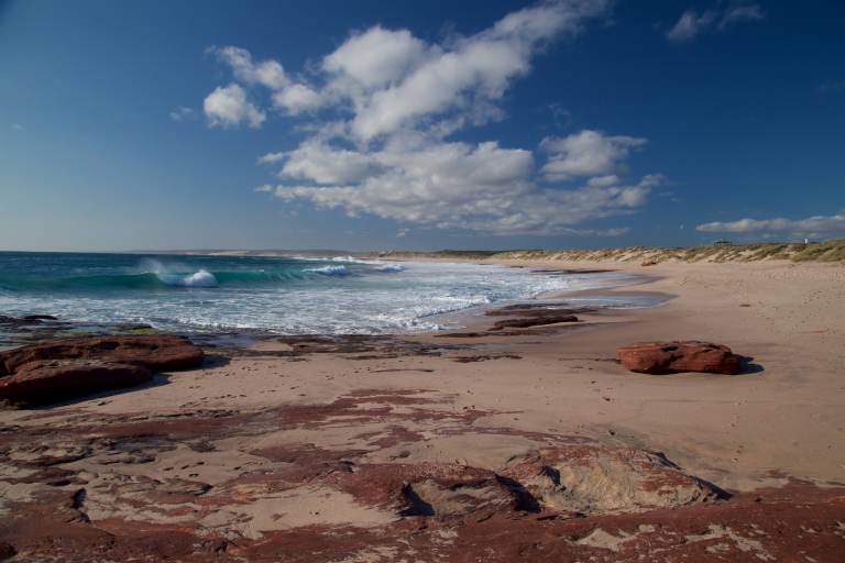 Während einer kleinen Wanderpause schmeißen sich mehrere Wale extra für uns durch das Wasser, damit es nicht zu langweilig wird 😉 Auf dem weiteren Weg wird Simona von einer Australischen Biene attackiert, überlebt es aber Dank Flos heroischer Rettung knapp. Nach so einer schönen Wanderung lassen wir den Tag (wieder mit Flip Flops an den Füßen) am Red Bluff Lookout ausklingen, wo in der untergehenden Sonne zwei Delphine durch das Wasser schwimmen. Abends gönnen wir uns in Kalbarri einen Campingplatz mit einer Dusche und nutzen den Grill, um uns mit Blick auf das Meer und die untergehende Sonne ein leckeres BBQ zu machen.