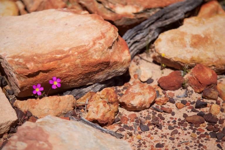 Am nächsten Tag schauen wir uns noch die tägliche Pelikanfütterung in Kalbarri an und starten dann zu einer Wanderung im „Inland-Teil“ des Parks, der aus einem Fluss mit einer tiefen Schlucht besteht. Hier sieht es komplett anders aus als am Vortag. Da gerade Wildblumenblüte ist, ist der staubig rote Sandboden mit bunten Blümchen übersät. Wir haben Glück, dass es mit ca. 24 Grad am oberen Rand der Schlucht angenehm kühl ist. Im Sommer wird es hier oft über 40 Grad warm (im inneren der Schlucht am Fluss kann es dann noch 10 Grad wärmer sein). Bei den aktuell „kühleren“ Temperaturen wählen die meisten Australier ihren Kleidungsstil zumindest morgens und abends so aus, als würden sie jeden Moment zu einer Antarktisexpidition starten.