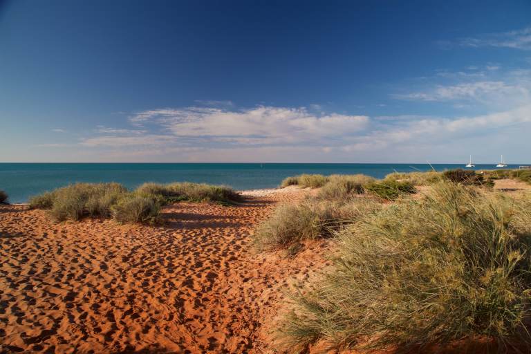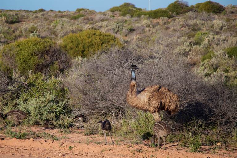 Schon nach kurzer Zeit haben wir uns wieder an den Linksverkehr gewöhnt. Nur ab und an wird beim Abbiegen noch die Scheibe gewischt. Blinken ist aber bald aus zwei Gründen nicht mehr nötig. Erstens: Es gibt niemanden mehr außer ein paar Emus, für die man blinken müsste. Und zweitens: Die Straße geht Kilometerlang einfach nur geradeaus (der aktuelle Rekord liegt bei 62km und wäre sogar noch getopt worden, wenn wir nicht links zur Shark Bay abgebogen wären…). Die Shark Bay bezeichnet eine Halbinsel ca. 800km nördlich von Perth, die zum UNESCO-Weltkulturerbe zählt. Bekannt ist sie vor allem für die Delfine von Monkey Mia, die jeden Morgen dorthin kommen. Es gibt aber auch viele kleine Riffhaie dort, was der Bucht ihren Namen gibt.
