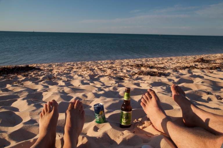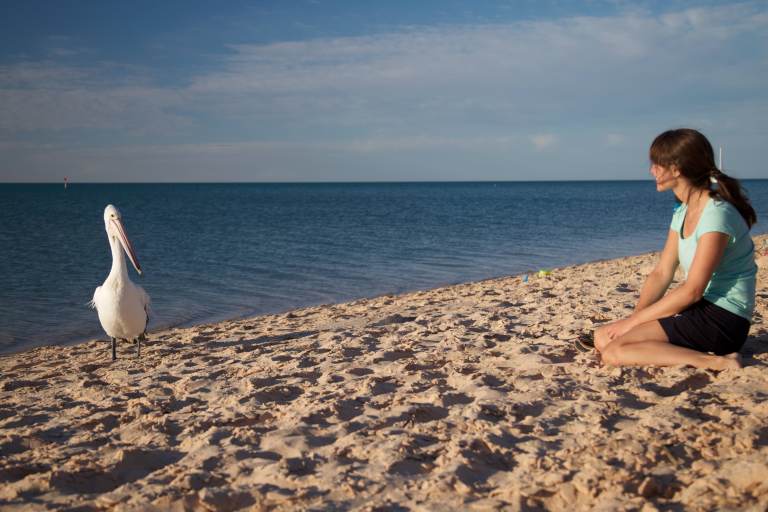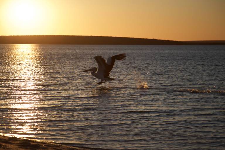 Wir steuern zunächst die „Hauptstadt“ der Shark Bay, Denham, an. Mit 1000 Einwohnern handelt es sich hierbei nicht um eine Großstadt :-). Hier wollen wir uns auf die Suche nach einem Four-Wheel-Drive-Verleih machen, um in den nächsten Tagen ein Auto für den Francois Peron Nationalpark (nur mit Allradfahrzeug befahrbar) auszuleihen. Der Verleiher, den wir eigentlich im Auge hatten (Jeep mit Dachzelt, sodass wir über Nacht im Park bleiben können), hat leider sonntags zu. Da genau aber der Sonntag in unseren Plan passen würde, müssen wir uns eine Alternative überlegen. Wir finden in Denham, das übrigens im Wesentlichen nur aus einer einzigen Straße am Meer besteht, ein sehr nettes Ehepaar, das neben Strandappartments glücklicherweise auch noch Four-Wheel-Drives vermietet. Sie sind sehr nett und reservieren uns formlos ein Auto für Sonntag. Zufrieden über die geglückte Mission machen wir uns auf den Weg in das ca. 40km entfernte Monkey Mia, wo wir auf dem Campingplatz übernachten wollen. Wir bekommen einen wunderschönen Stellplatz mit Meerblick. In der untergehenden Sonne beobachten wir bei einem Bier/einer Sprite/einem Möhrensaft/einem Eukalyptustee die Pelikane am Strand, die bei den Anglern am Strand mal nachschauen, ob zufällig noch ein Fisch übrig ist. Simona und Flo sind ganz entzückt. Etwas kitschig wird es, als im Sonnenuntergang auch noch zwei Delfine am Strand vorbeischwimmen, aber es ist wirklich so. Kann man nix machen.