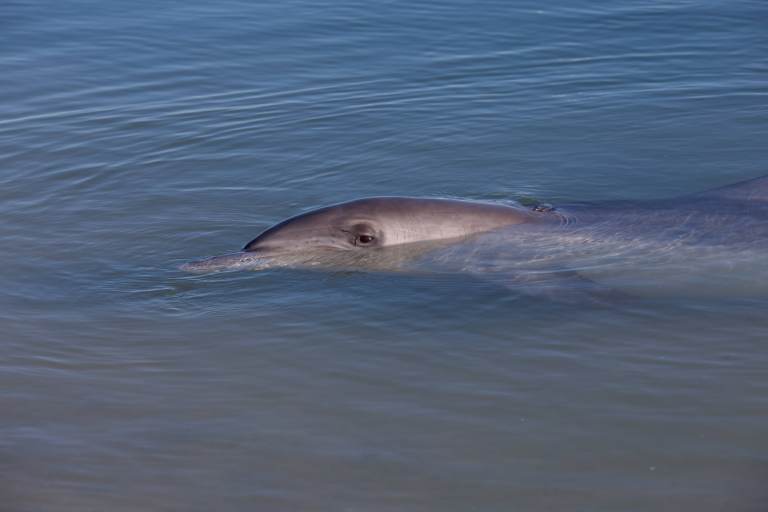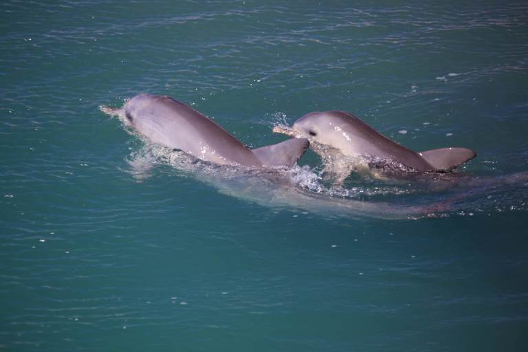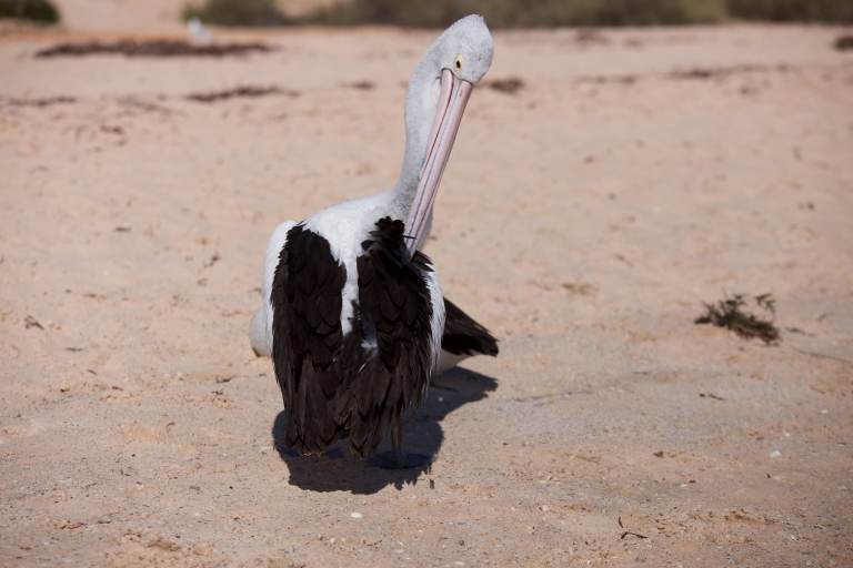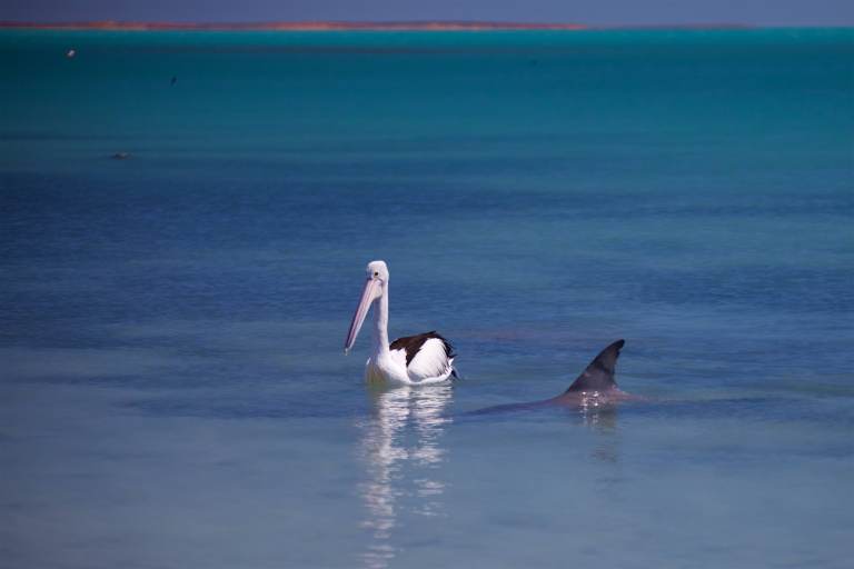 Am nächsten Morgen stehen wir früh auf, denn jeden Tag um 7:45 Uhr kommen die Delfine an den Strand. Das geht seit den 60er Jahren so, seit Fischer damit angefangen haben, vorbeikommende große Tümmler mit Fischresten zu füttern. Damit das auch so bleibt, bekommt jeder an den Strand kommende Delfin morgens 3 Fische von den Rangern. Das ist nicht wirklich viel, wenn man bedenkt, dass jeder Delfin pro Tag ca. 10 kg Fisch fängt. Wenn man nach dieser Morgenattraktion mit recht vielen Touristen noch etwas länger an dem traumhaften Strand bleibt, kommen die Delfine bei etwas Glück noch einmal zurück. Und wir hatten Superglück. Nach einem Frühstück gehen wir mit Flos zweitem Kaffee und Badesachen zurück zum Strand. Wir haben uns noch nicht richtig nieder gelassen, da schwimmen schon wieder zwei Delfine im flachen Wasser. Richtig putzig ist es, zu beobachten, wie die Pelikane ganz unauffällig neben den Delfinen herschwimmen, um möglicherweise einen übrig gebliebenen Fisch zu ergattern, die die Delfine bei ihrer Jagd zusammentreiben. Wir wundern uns etwas: Es gibt einen wunderschönen Strand, an dem sich Delfine und Pelikane tummeln und außer uns sind nur etwa 15 andere Leute da. Finde den Fehler. Außer Simona ist auch niemand im Wasser, denn die Wassertemperatur beträgt etwa 18-20 Grad. Das ist für die meisten Australier (und auch für Struppel, Flo und mich) definitiv zu kalt. Aber wann hat man schonmal die Gelegenheit, an 30 Meter entfernten Delfinen vorbeizuschwimmen? Diese Gelegenheit will Simona unbedingt nutzen! Draußen ist es mit ca. 26 Grad und recht starker Brise dagegen sehr angenehm. Wir verbringen den ganzen Tag am Strand unter einer Palme und beobachten Delfine und Pelikane, die sich bis zu unserer Abreise gegen 15:30 Uhr dort nicht wegbewegen. Wir können die Delfine beim Fische jagen und Herumtoben im Wasser beobachten.