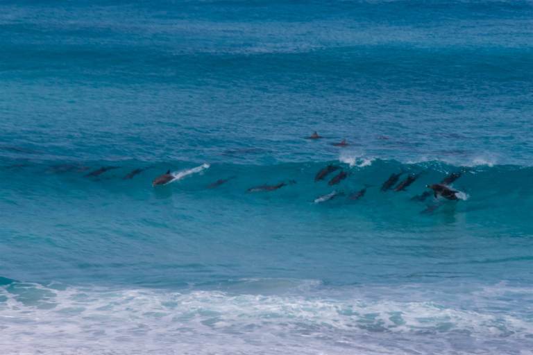 Auf der Strecke Perth-Esperance quer durch Weizen- und Rapsfelder sowie verwunschene kleine Wäldchen kommen uns fast noch weniger Menschen entgegen, als auf den 1400km durch das Outback zwischen Newman und Perth. Wir übernachten nochmal „im Busch“ bei Raventhorpe, 200km westlich von Esperance. Am nächsten Morgen fahren wir früh los. Da es um 6:30 Uhr in Raventhorpe nur 5 Grad sind, verzichten wir auf ein Früshtück in der Kälte und beschließen, in Esperance am „Great Ocean Drive“ auf einem Aussichtspunkt an der Küste zu frühstücken. Aufgrund des großen Hungers nehmen wir gleich den ersten am West Beach. Bei jetzt angenehmen 20 Grad gibt es auch noch ein kleines I-Tüpfelchen: zur wunderschönen Aussicht surft eine Gruppe von ca. 25 Delfinen durch die hohen Wellen, teilweise zuammen mit menschlichen Surfern. Während wir mit Blick auf die Delfine unser Müsli mit Obst essen, gesellt sich eine Frau mittleren Alters zu uns, die in Esperance lebt und jeden Morgen an diesem Strand Sport treibt. Wir unterhalten uns mit ihr und erzählen ihr, dass wir heute Nachmittag weiter in den 50km entfernten Cape le Grand Nationalpark fahren wollen. Sie fragt uns: „Has anyone told you about Lucky Bay?“. Als wir ihr erzählen, dass wir gestern auf dem sehr beliebten Nationalparkcampingplatz dort für zwei Nächte einen Platz reserviert haben, lächelt sie erleichtert. Als wir uns von ihr verabschieden, steigt sie extra nochmals aus ihrem Auto aus, um uns zu sagen, dass wir auf die Schlangen im Park aufpassen sollen. Diese erwachen im Frühling aus dem Winterschlaf und sind sehr hungrig. Insbesondere die Babyschlangen wissen noch nicht so richtig, wie man mit menschlichen Schritten in der Nähe umgeht. Wir hoffen, dass keine der Schlangen im Cape Le Grand Nationalpark so hungrig aus dem Winterschlaf erwacht, dass Simonawaden oder Flowaden auf dem Speiseplan stehen.