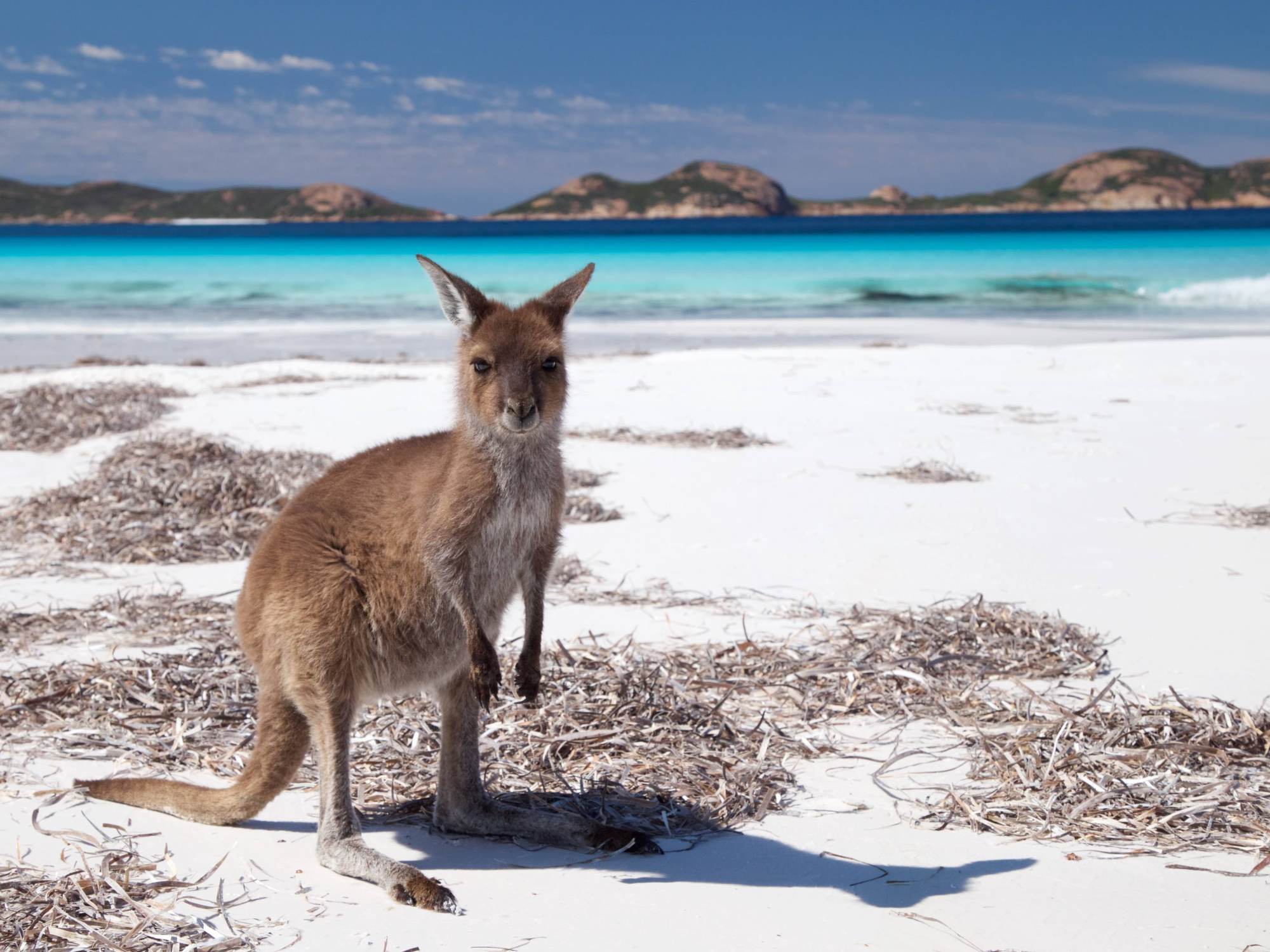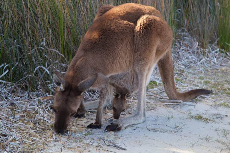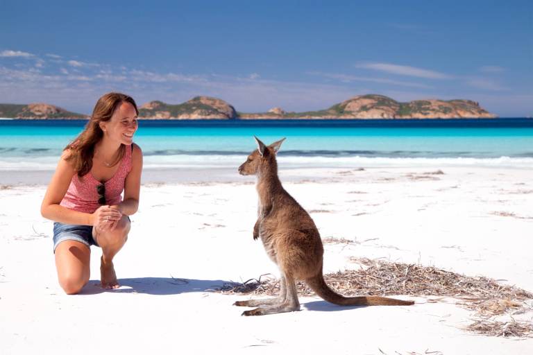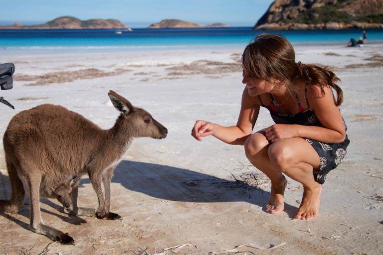Nachdem wir uns ein bisschen durch die fantastischen Aussichtspunkte des Great Ocean Drive in Esperance haben treiben lassen, machen wir uns nachmittags auf den Weg in den Cape le Grand Nationalpark. Wir steuern den Parkplatz von Frenchman Peak an, die mit knapp 300m höchste Erhebung des Parks. Von dort aus klettern wir die 300 Höhenmeter hinauf, um den wundervollen Ausblick und unsere mitgebrachten Choco Chip Muffins zu genießen. Wären Flo und Simona nicht schon verheiratet, hätte Flo ihr jetzt einen Heiratsantrag gemacht, denn wie so oft in den letzten Wochen sind wie vier mit der herrlichen Aussicht alleine. Nachdem wir wieder abgestiegen sind, machen wir uns auf den Weg zum Lucky Bay Nationalpark Campground, der wunderschön am Meer gelegen ist. Der Sand ist so weiß und fein und das Meer so blau, dass die Lucky Bay zur schönsten Bucht Australiens gewählt wurde. Kann man nachvollziehen, es ist einfach schon fast unwirklich schön. Alle der ca. 50 Plätze haben Meerblick. Wie immer im Nationalpark gibt es keinen Strom, kein Handynetz, kein Trinkwasser. Aber tatsächlich eine solarbeheizte Dusche (je nach Wetter ist sie auch einigermaßen warm). Am nächsten Tag machen wir vormittags eine 10km lange Wanderung entlang der Küste zum „Lucky Bay Lookout“ und zur „Thistle Cove“ mit wunderschönen Ausblicken und bunten Wildblumen, die überall jetzt blühen. Nach der Wanderung haben wir uns eine Abkühlung verdient. Das Meer ist noch ziemlich kalt, Simona und Flo gehen trotzdem kurz im kristallklaren Wasser schwimmen. Struppel und ich bleiben lieber am Strand im Schatten und spielen ein bisschen mit meinen Artgenossen, die hier am Strand und auch auf dem Campingplatz regelmäßig rumhopsen. Sie sind sehr neugierig und aufgeweckt und überhaupt nicht scheu. Nach einem wunderschönen Tag liegen wir abends noch lange mit offener Heckklappe im Bett und schauen in die Sterne, denn hier ist die Milchstraße eine Milchautobahn.