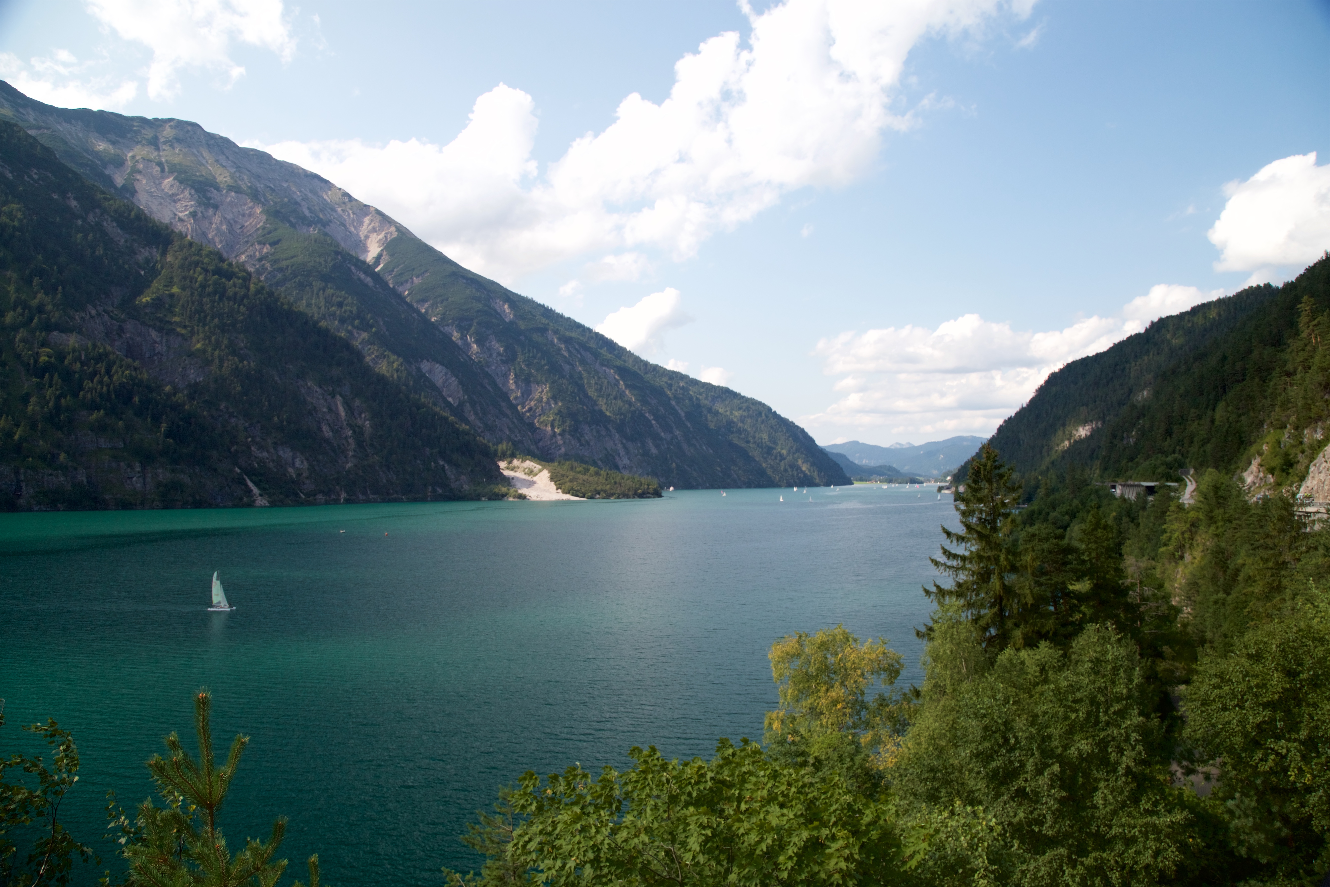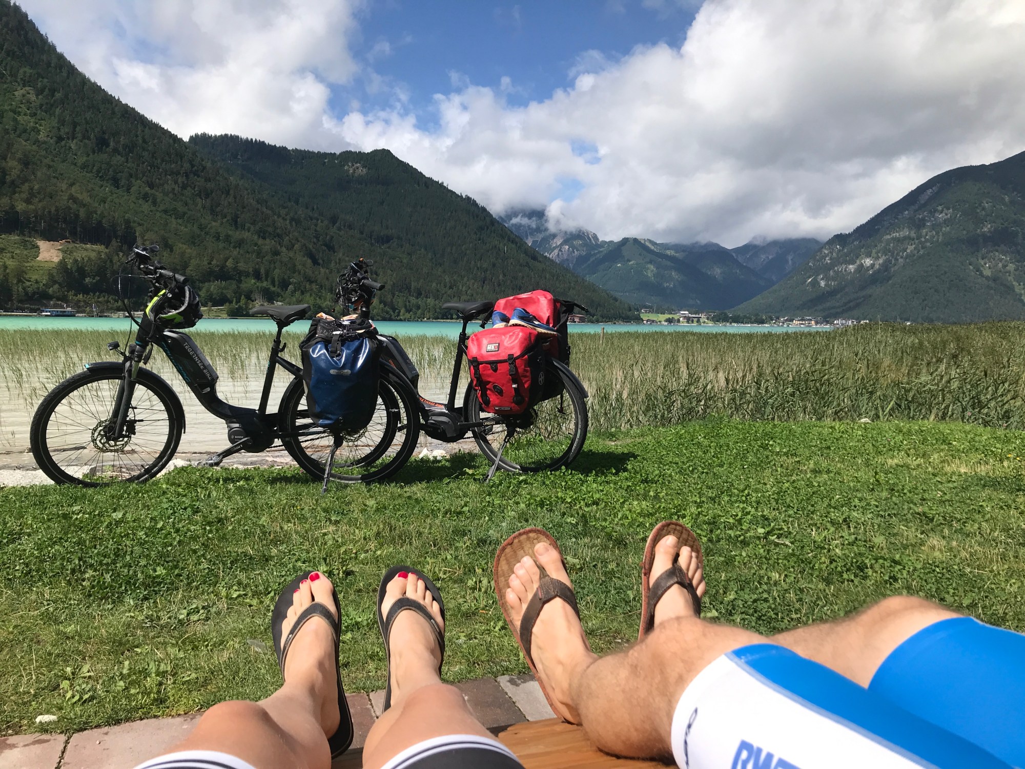 Als wir aufwachen, regnet es. Wir frühstücken trotzdem draußen auf der überdachten Terasse. Das Frühstück von Oma Bartl ist sehr liebevoll angerichtet, es gibt unter anderem selbst gemachte Marmelade. Aufgrund des angesagten ergiebigen Dauerregens überlegen wir kurz, alles umzuschmeißen, die Tour umzudrehen und den Regentag dazu zu nutzen, ans Ziel zu fahren. Das hätte aber a) ein deutlich ungünstigeres Höhenprofil und b) die Notwendigkeit bedeutet, alle Hotels und Pensionen umzubuchen. Zudem haben wir uns für den letzten Tag ein etwas teureres Hotel mit Pool gegönnt, das wir ja auch bei Sonnenschein nutzen wollen. Also lassen wir alles wie es ist. Für die weiteren vier Tage sind immerhin Sonnenschein und angenehme 22-25 Grad angesagt. Wir entscheiden uns also, trotzdem loszufahren. Prompt hört es auf zu regnen. Wir packen unsere nötigsten Dinge für 4 Tage und 5kg Möhren für Finchen in unsere Fahrradpacktaschen. Als wir unsere Miet-E-Bikes abholen, kommt sogar die Sonne raus und lacht die nächsten Stunden vom blauen Himmel. Erstmal nix von ergiebigem Dauerregen. Kaum zu glauben, wir haben eben fast immer Glück. Die erste Etappe führt vom Tegernsee über den Achenpass zum Achensee und ist mit knapp 50km und 400hm eine leichte Einstiegsetappe. Kaum auf Passhöhe die Grenze zu Österreich überschritten kauft Flo in einem kleinen Grenzpostenlädchen ein Stück Käse. Die Verkäuferin erzählt, dass sie dafür schon die Käsemedallie bekommen hat. Fragt sich nur bei welchem Wettkampf, das hat sie uns nicht erzählt. Passend dazu kaufen wir bei einer Bäckerei noch zwei Kornstangen für die Jause. Kaum am Achensee angekommen lassen wir uns für eine Mittagspause mit gekochtem Ei, Kornstangen und Weltmeisterkäse (der übrigens wirklich sehr lecker ist) nieder. Mittlerweile ist es bewölkt und kaum haben wir unsere Mittagspause beendet, fängt es an, zu regnen. Jetzt sind es nur noch 10km bis zum Ziel. Der Regen wird immer stärker, es schüttet wir aus Eimern und die Schuhe werden zu einem See.
