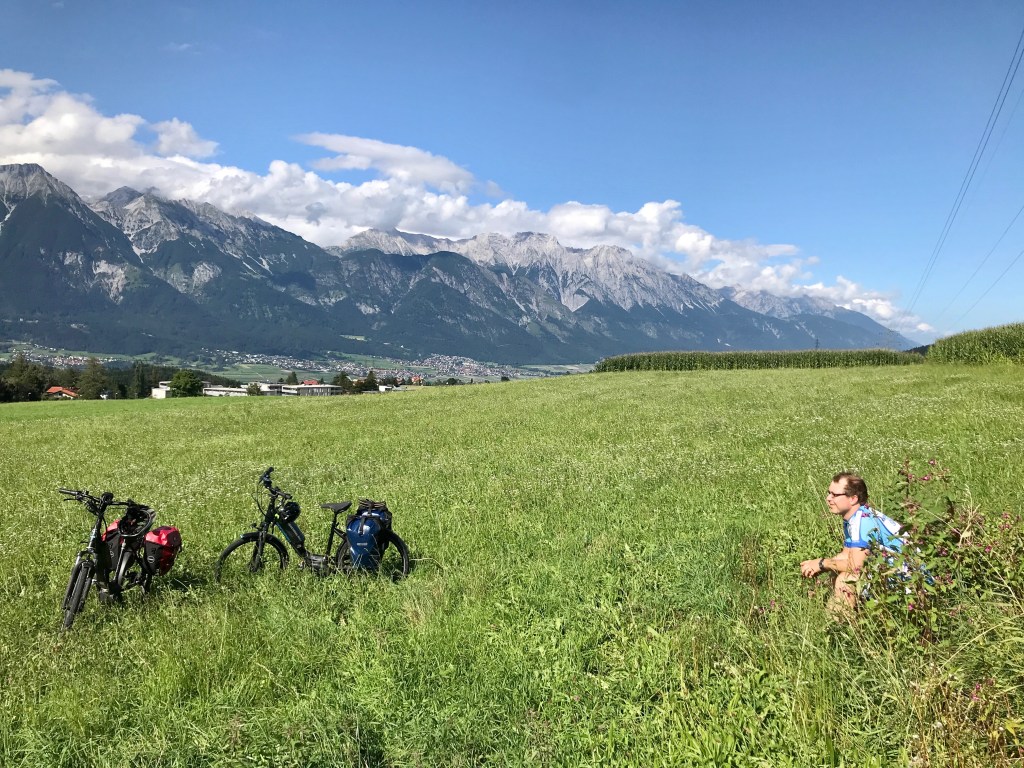 Unsere Fahrradklamotten sind über Nacht getrocknet, aber aus dem Bad kriecht ein Muff wie nasser Hund – unsere Schuhe! Die sind immernoch pitschnass. Nach einem ausgiebigen Frühstück checken wir aus und suchen uns eine gemütliche Bank mit schönem Blick in der Sonne, um unsere Schuhe und Socken trocknen zu lassen. Wir lassen es heute gemütlich angehen, zur Not kann ja immernoch der Turbogang am E-Bike rausgeholt werden. Normalerweise fahren wir akkuschonend im Eco Modus (Flo immer, Simona schaltet bei starken Anstiegen auch ab und an mal auf die zweite von vier Stufen…). Als die Schuhe trocken sind düsen wir hinunter ins Inntal, dann geht es einige Kilometer den Inntalradweg entlang, bis wir kurz hinter Hall in Tirol bergauf Richtung Brenner abbiegen. Ab jetzt geht es den Rest der Etappe nur noch bergauf bis zu unserem Tagesziel, dem Grünwalderhof in Patsch. Dieses Hotel ist ziemlich antik, man könnte es stellenweise auch heruntergekommen nennen. Laut Infotafel handelt es sich um ein Schloss von Turn und Taxis. Altersbedingt schließt keine Tür mehr richtig. Und kein Fenster. Aber es hat Charme. Und vor allem eine grandiose Sonnenterasse mit großer Wiese und einer Wahnsinnsaussicht. Wir nehmen einen Aperol Spritz und unser Buch und lassen den Abend auf der Terasse mit Blick auf die Berge ausklingen. Nach einem herrlichen Essen schnarchen wir bei Turn und Taxis bis zum nächsten Morgen.