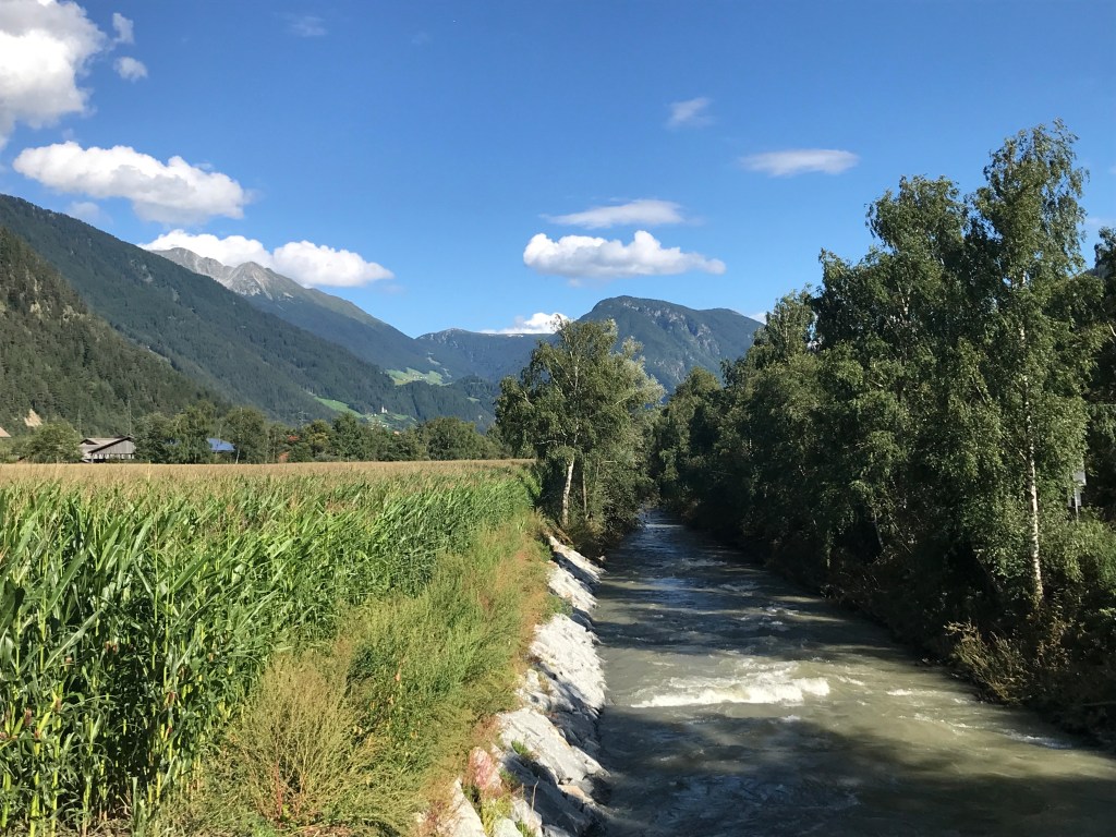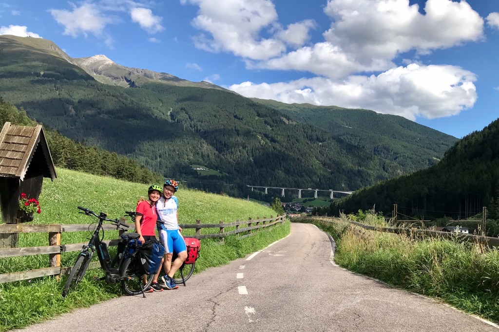 Nach einer etwas weniger ruhigen Nacht bei Turn und Taxis (auch unsere Nachbarn haben geschnarcht, davon hatten wir dank der altersgebrechlichen Wände auch etwas) und einem ausgiebigen Frühstück machen wir uns bei wieder schönstem Wetter und angenehmen 23 Grad wieder auf den Weg. Heute geht es weiter hoch bis zum Brenner. Der Anstieg ist nicht so extrem steil wie erwartet. Aufgrund des fehlenden Passschildes müssen wir unser Siegerfoto mit dem „Brenner“-Schild des Bahnhofs im Hintergrund machen. Gemütlich ist der Ort auf jeden Fall ganz und gar nicht. Also beschließen wir, die Mittagspause noch etwas zu verschieben. Wir rollen gemütlich die zum Fahrradweg umfunktionierte alte Bahntrasse hinunter Richtung Sterzing. Da es ewig keine Pausenbank gibt, muss die Rast eben auf einer Wiese Gras stattfinden. Das ist aber auch nicht weiter schlimm. Hauptsache der Weltmeisterkäse kann mit schönem Blick auf die Berge verspeist werden, denn dann schmeckt er doppelt so gut. Für mich gibt es Möhren und Struppel ist am schlafen. Nach der Stärkung geht es weiter bergab nach Sterzing in Südtirol, einem wirklich schönen Städtchen. Wir haben uns jedoch bewusst für eine Pension entschieden, die noch 10km weiter in Pfulters in der Natur liegt. Im gefühlt 20-Seelen-Nest angekommen sind wir begeistert von der gemütlichen, ruhig gelegenen Pension mit herrlichem Ausblick und herzlicher Gastgeberin. Nach einem super leckeren drei-Gänge Menü schlafen wir wie ein Stein – diesmal auch mit schließenden Türen und Fenstern. Das war der anstrengendste Tag, dachten wir zumindest.