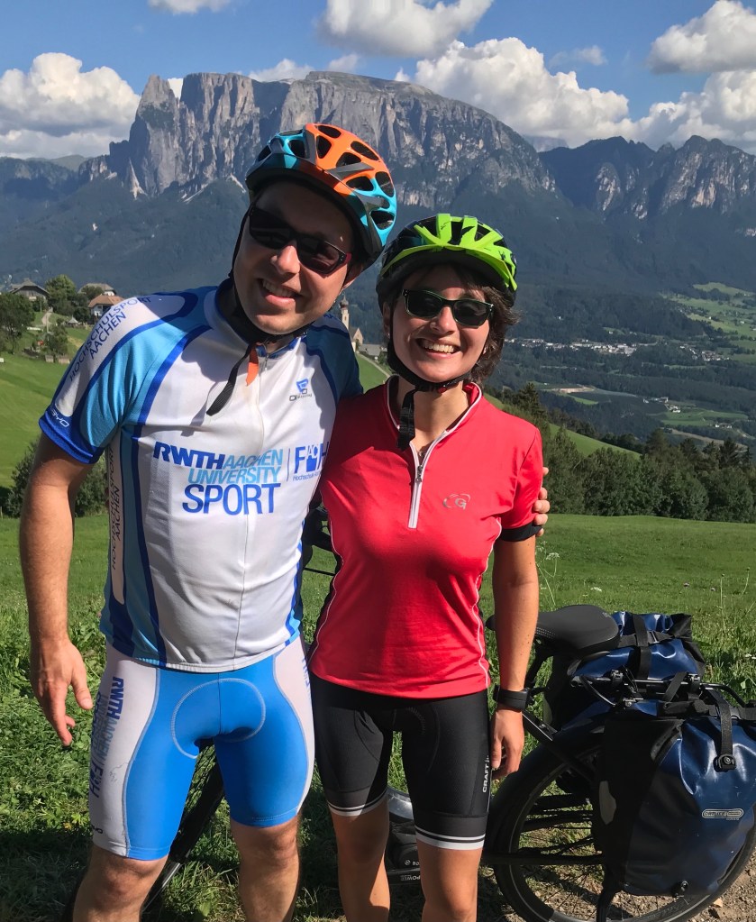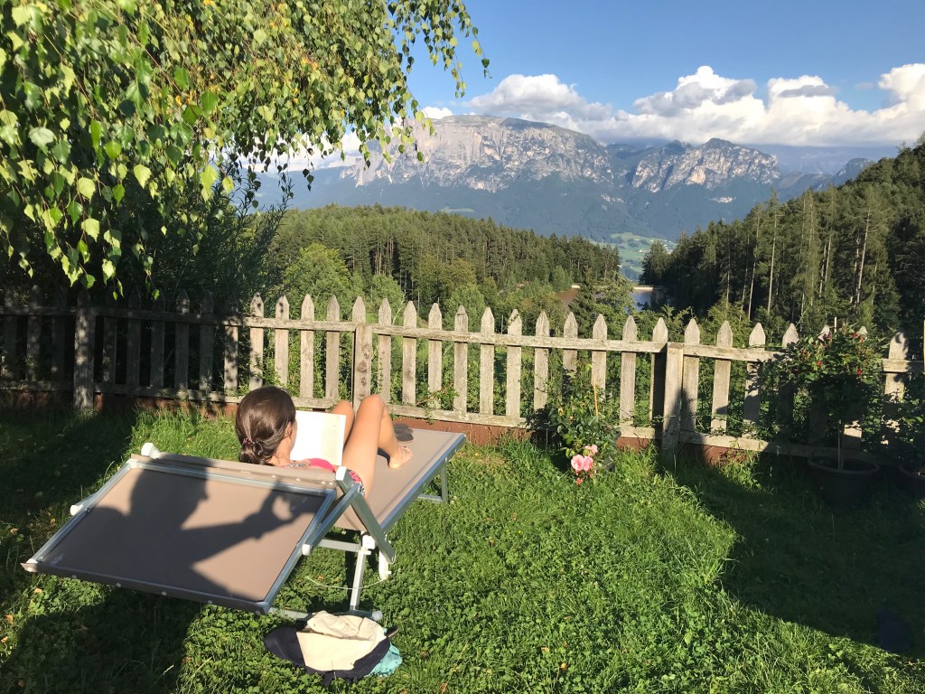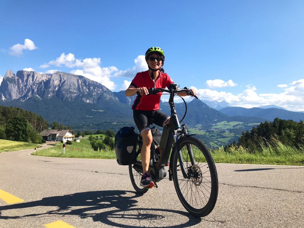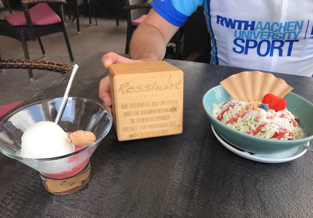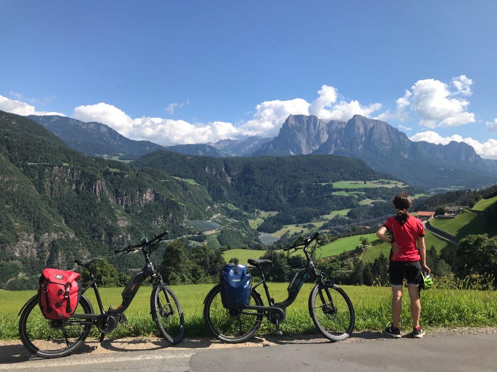 Bei wieder wunderschönem Wetter und angenehmen 24 Grad starten wir an diesem Morgen Richtung Tourenziel Bozen. Unser Hotel liegt jedoch auf der Höhe in Oberbozen, 1000 Höhenmeter oberhalb von Bozen. Man kann jedoch mit einer Seilbahn von Bozen aus hinauf fahren, soweit der Plan. Zunächst düsen wir von Pfulters aus hinunter ins Tal. Dabei knackt Flo den Geschwindigkeitsrekord des Fahrrads mit 60km/h. Die Etappe führt 65km immer meist leicht bergab. In Klausen, 20km vor dem Ziel, fühlen wir uns etwas unterfordert. Wir beschließen, die Route etwas abzuändern und die 1000 Höhenmeter mit dem Fahrrad zu bezwingen. So biegen wir kurz hinter Klausen rechts ab Richtung Barbian. Es geht steil bergauf. Flo bleibt tapfer im Ecomodus, Simona wechselt ab und zu mal in die zweite Unterstützungsstufe, später auch dauerhaft. Doch die Mühe lohnt sich – die Aussicht wird von Minute zu Minute toller. In Barbian machen wir Rast in einem Eiscafe mit traumhaftem Blick. Das Motto des Cafes passt perfekt zu uns und unserer Tour: Die schönste Zeit im Leben sind die Momente, in denen du spürst, du bist zur richtigen Zeit am richtigen Ort.