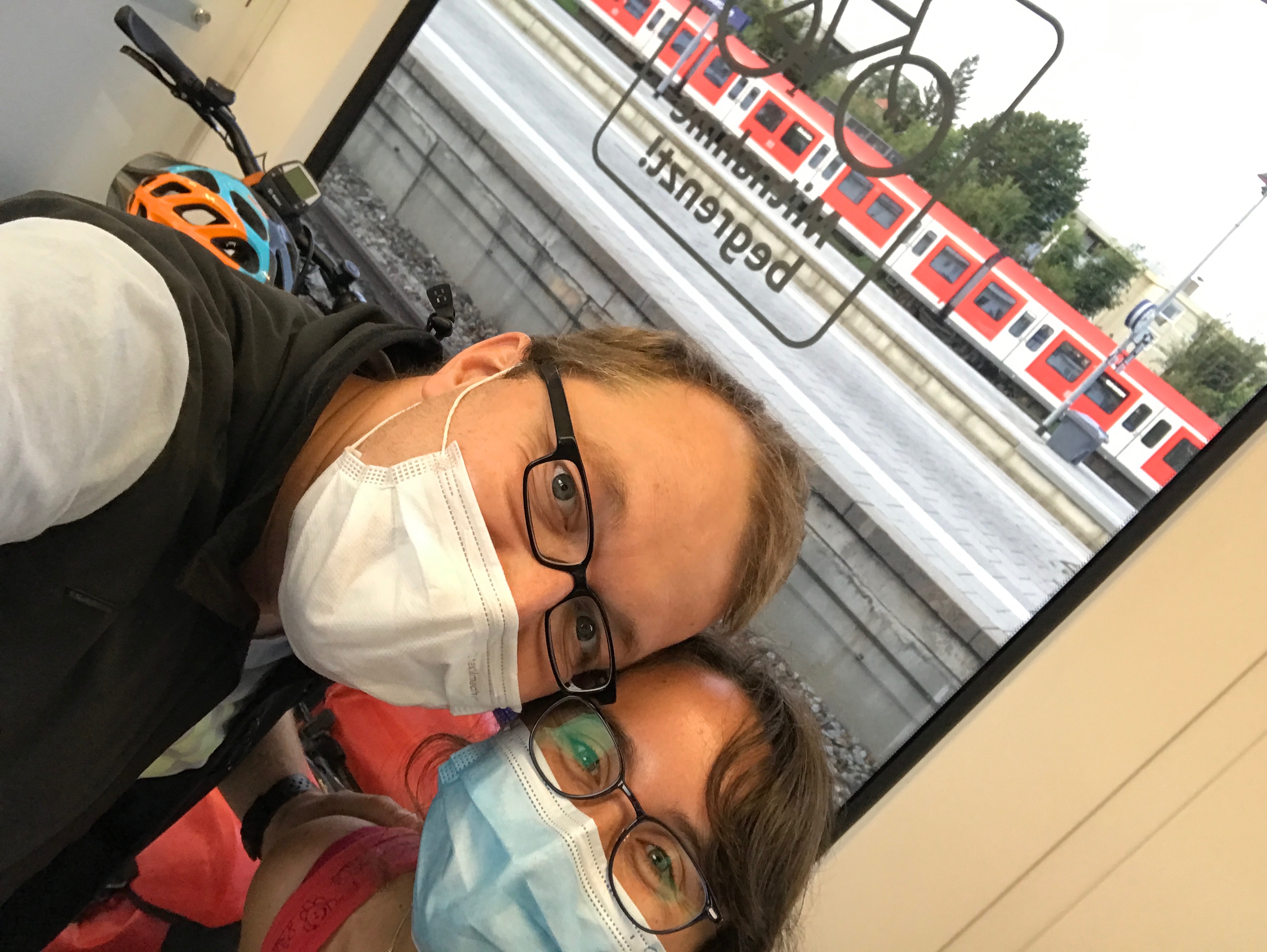 20:02 Uhr: Umstieg in den Zug zum Tegernsee. Der letzte Umstieg ist geschafft. Wir werden leicht hysterisch und machen eine Serie Selfies vor dem „Fahrradmitnahme begrenzt“ Schild.