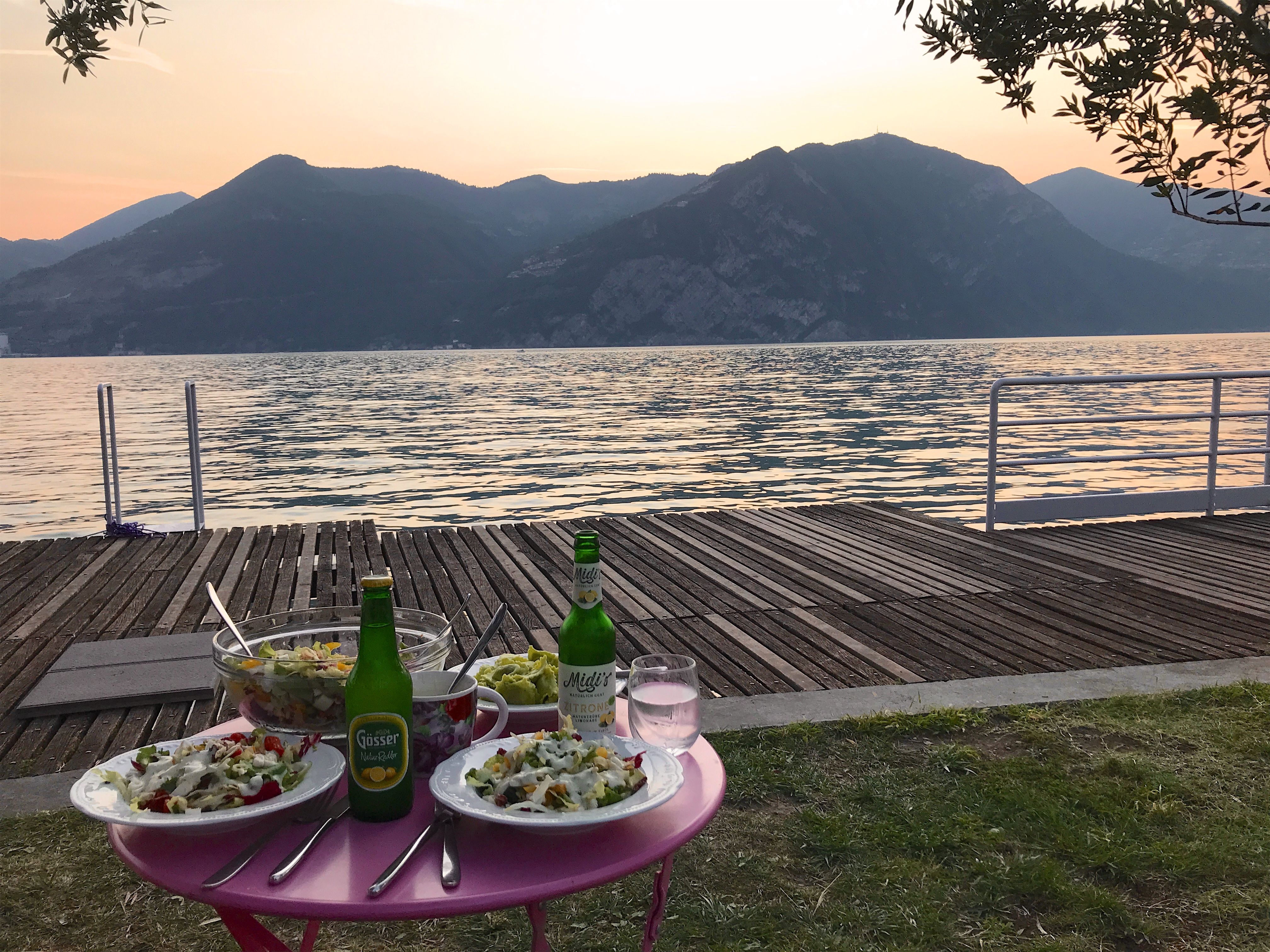 20:50 Uhr: Das erste Restaurant am See, das wir ansteuern, bietet keine warme Küche mehr an. Also weiter.