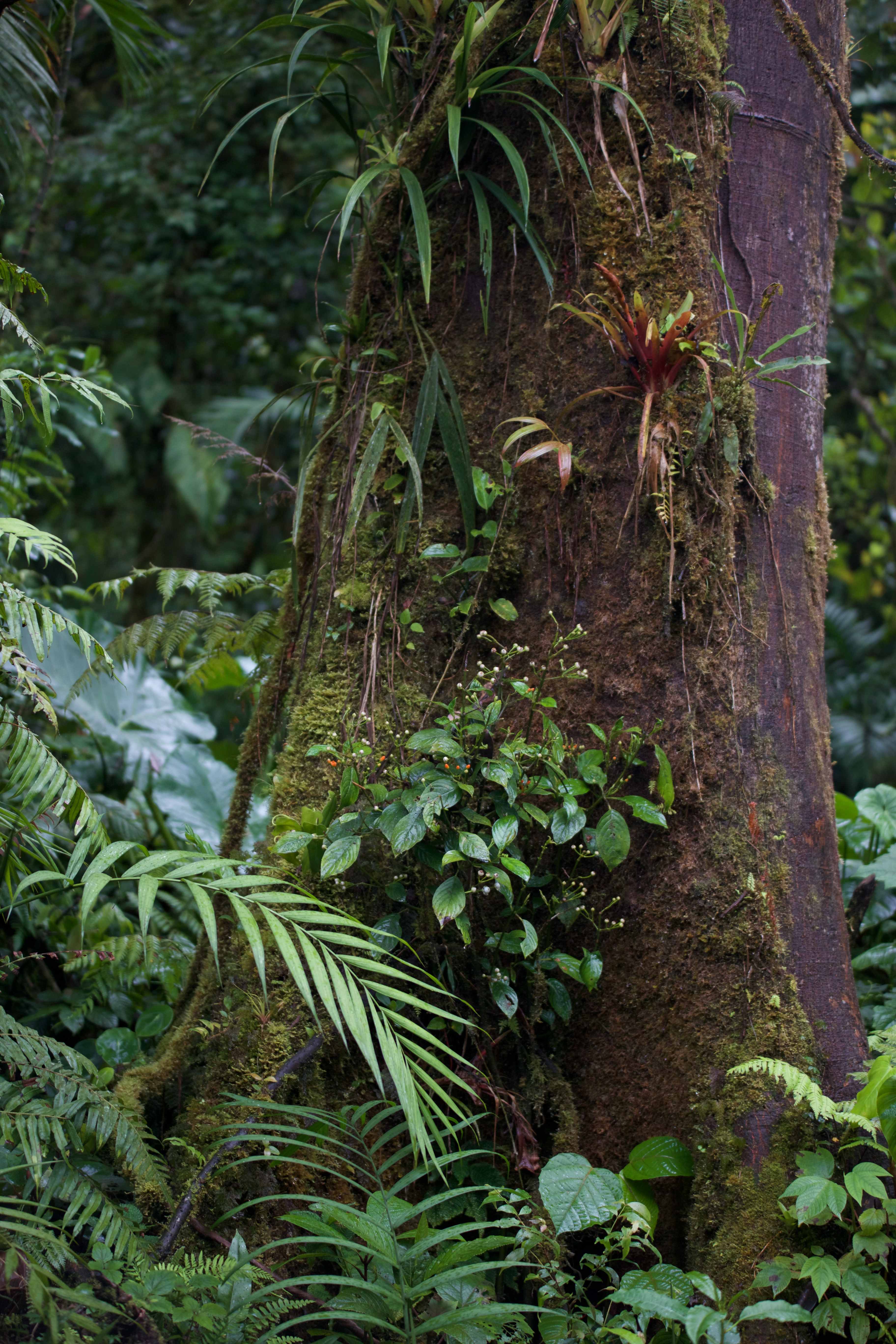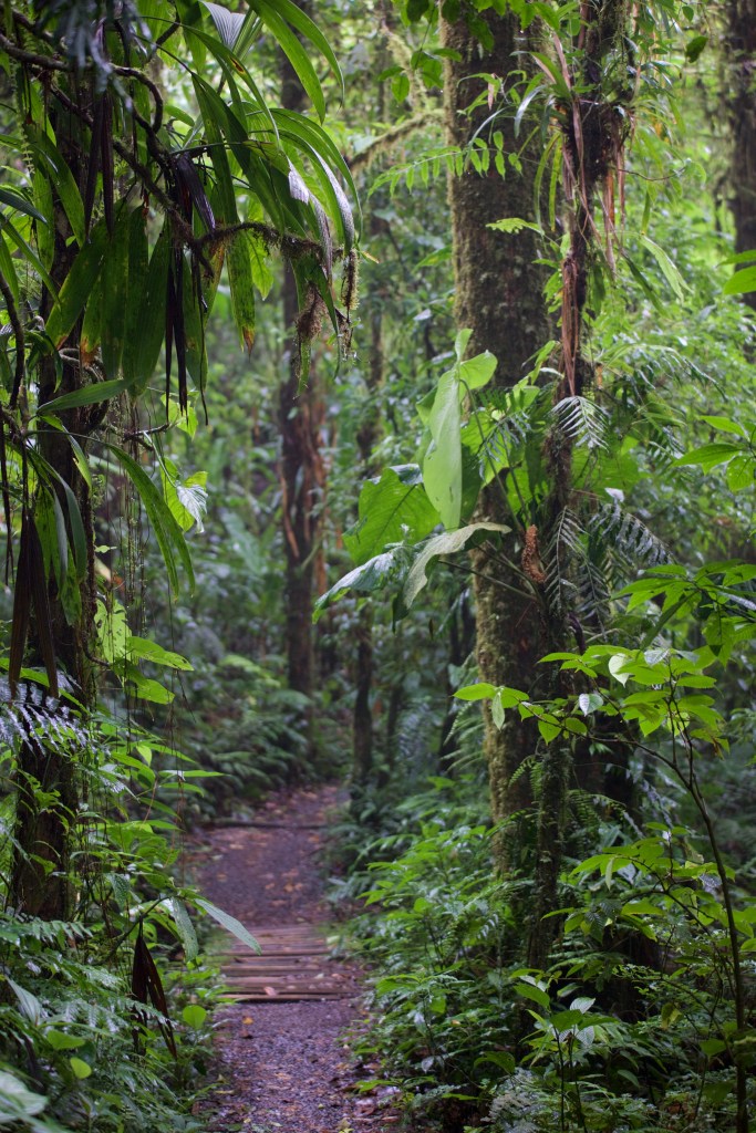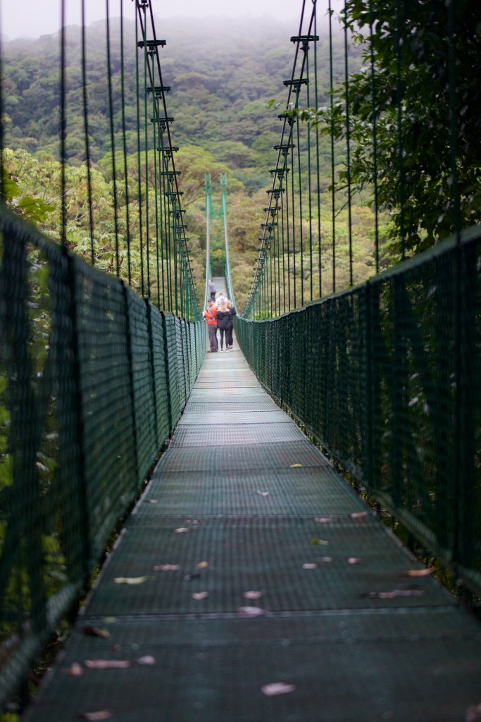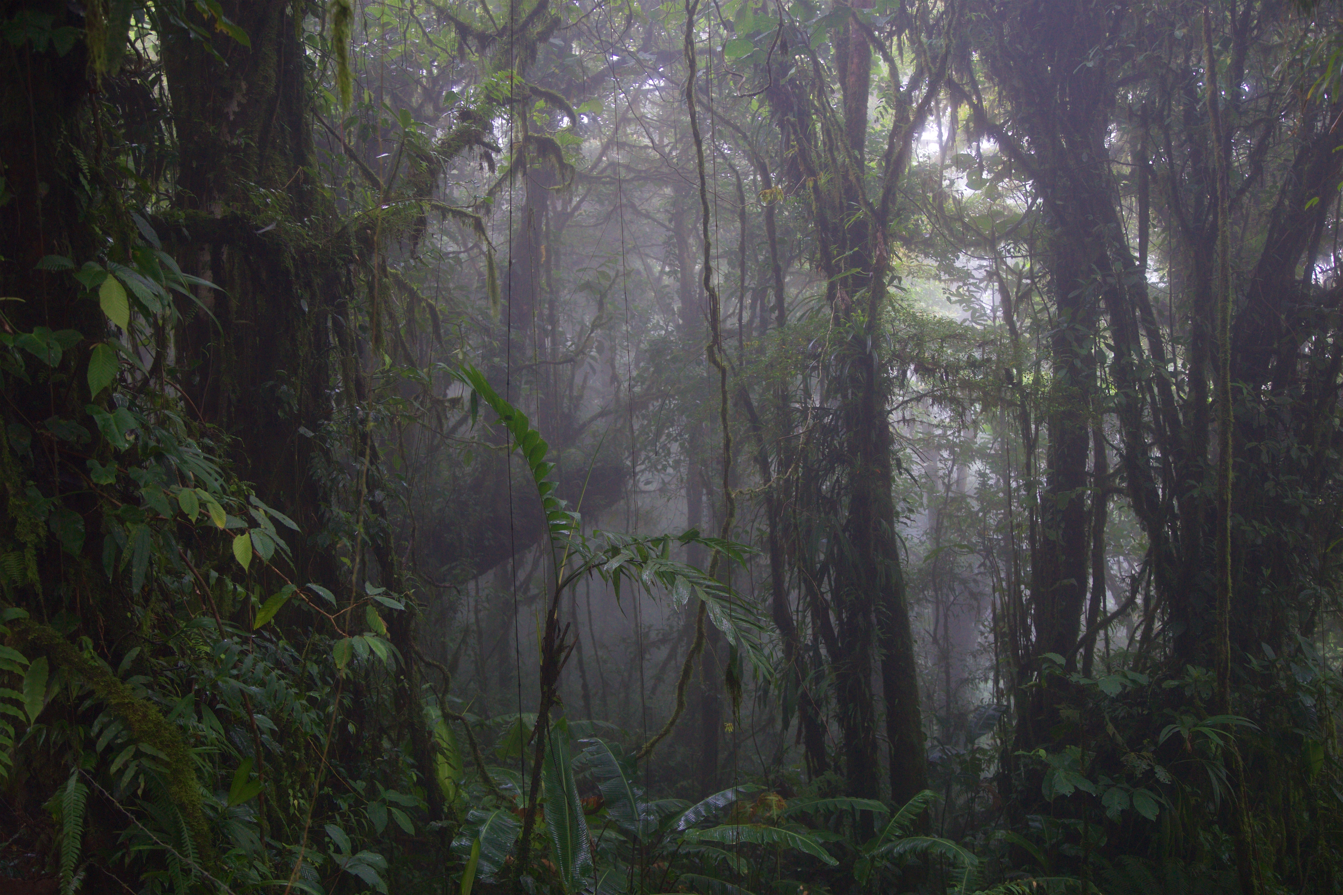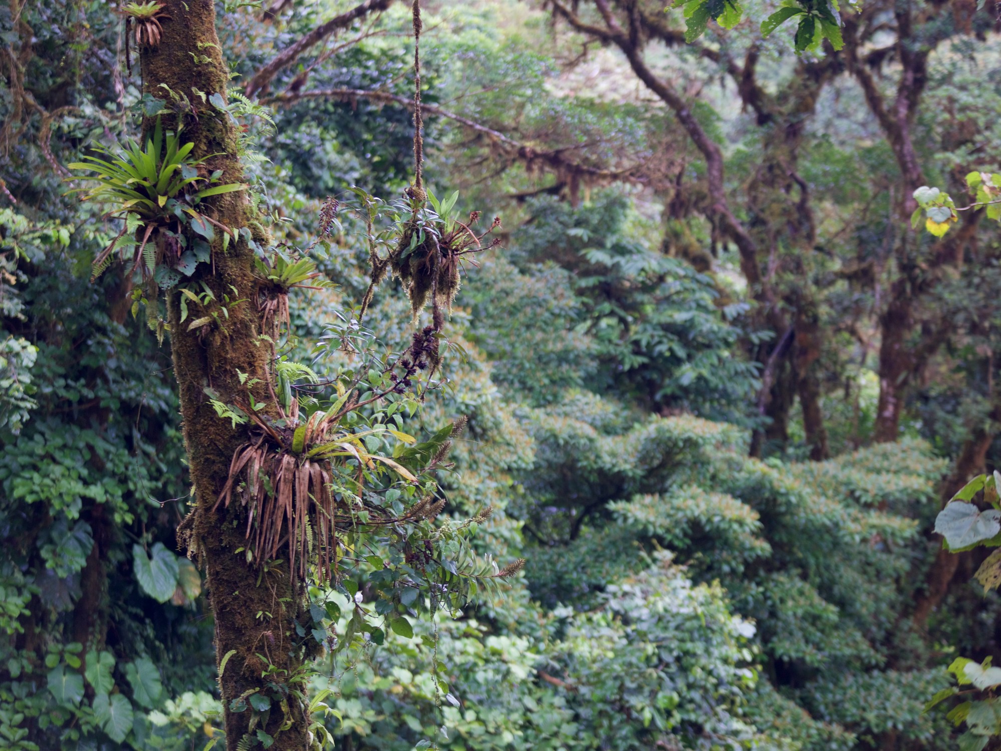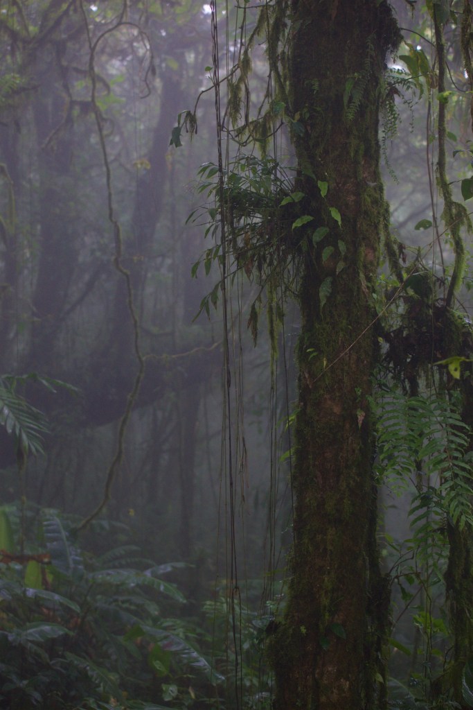Nach unserer tollen Tour im Carara Nationalpark machen wir uns auf den Weg in den Nebelwald von Monteverde im Inland von Costa Rica. Wir haben schon gelesen, dass es dort nur zwei Wetterzustände gibt: viel Regen und wenig Regen. Als wir uns die Berge nach Monteverde hinaufschlängeln wird es nebeliger und nebeliger. Irgendwie logisch, heißt ja auch Nebelwald. Als wir dann gegen 16 Uhr angekommen sind, schüttet es wie aus Eimern, sogar noch deutlich stärker, als wir es von der Pazifikküste gewohnt waren. Wir hoffen, dass es sich hier um den Zustand „viel Regen“ handelt. Innerhalb von Minuten verwandeln sich die Straßen zu Sturzbächen. Wir holen den Schlüssel zu unserem Häuschen im Zentrum von Santa Elena an. Dabei handelt es sich um ein „Bergdörfchen“, das mittlerweile zu einem touristischen Zentrum ausgebaut wurde, denn der Nebelwald wird vor allem in der Hauptsaision von vielen Touristen besucht. Hier ist auch das „Ziplining“ erfunden worden: Man stellt sich eine Spielplatzseilbahn vor. Diese hängt aber 50 Meter hoch in den Bäumen und man rast – natürlich gesichert – mit bis zu 60km/h kilometerweit über das Blätterdach. Macht bestimmt Spaß, aber wir haben uns aufgrund der extrem touristischen Aufmachung und der horrenden Preise dagegen entschieden.