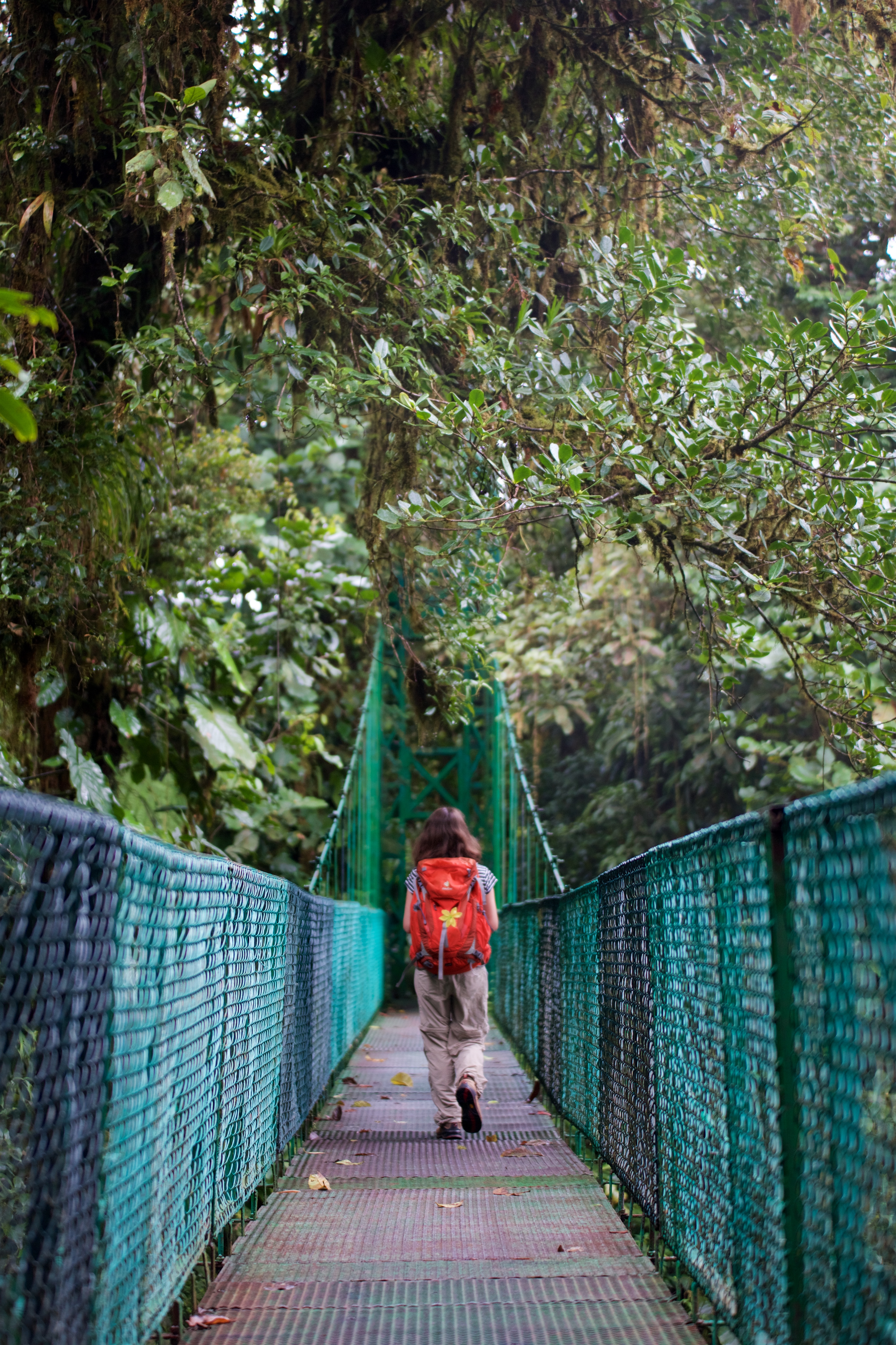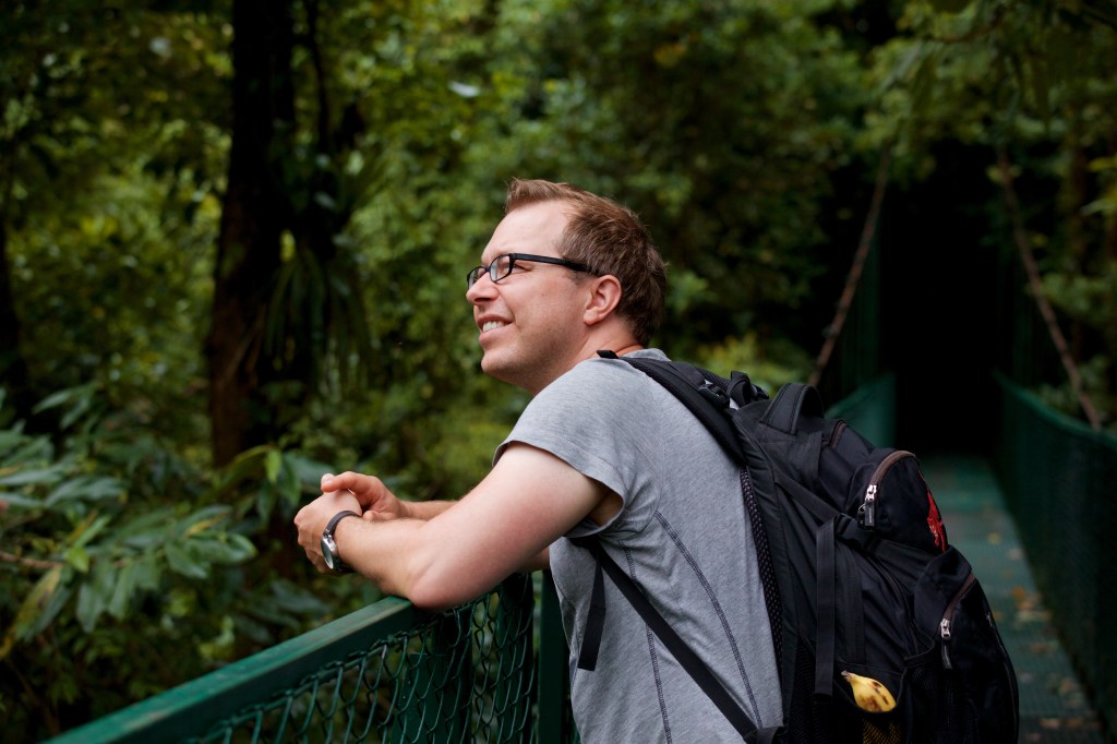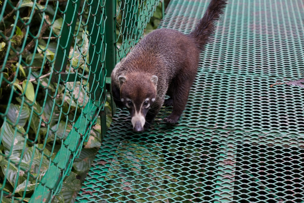 Am nächsten Tag beschließen wir, eine Wanderung über 8 Hängebrücken durch den Nebelwald zu machen. Als wir gegen 5:45 Uhr von der Sonne geweckt werden, wird Flo leicht hysterisch und cremt sich mit 50er Sonnencreme ein. Mal sehen, ob er die brauchen wird. Pünktlich um 8 Uhr fahren wir auf den Parkplatz des Hängebrückenparks und starten unsere Wanderung. Außer uns sind nur wenige andere Leute da – das hätten wir aufgrund der Werbung für den Park anders erwartet. Auf der Tour hat man wirklich fantastische Ausblicke sowohl im als auch über den verwunschenen Märchenwald. Das hat sich wirklich gelohnt. Auf einer Hängebrücke bringt Simona die Kamera für ein Selfie auf unseren gestapelten Rucksäcken in Position. An der Seite von Flos Rucksack befinden sich gut sichtbar zwei Bananen. Als sie durch die Kamera schaut, um die richtigen Einstellungen zu finden, schleicht sich hinter Flo ein Nasenbär an, der einfach mal gucken wollte, was es hier so gibt. Simona und Flo können ihre Bananen gerade noch so retten. Und ich meine Möhre auch.