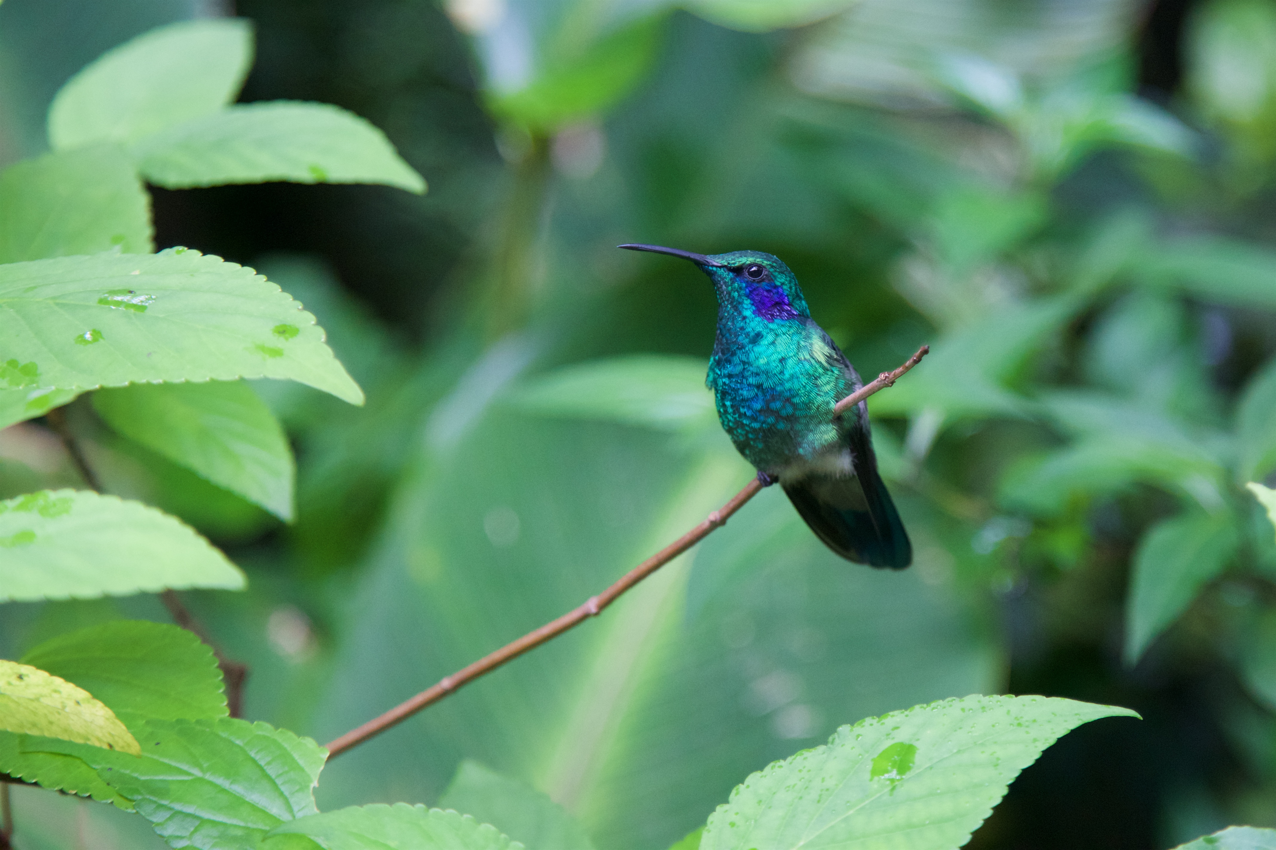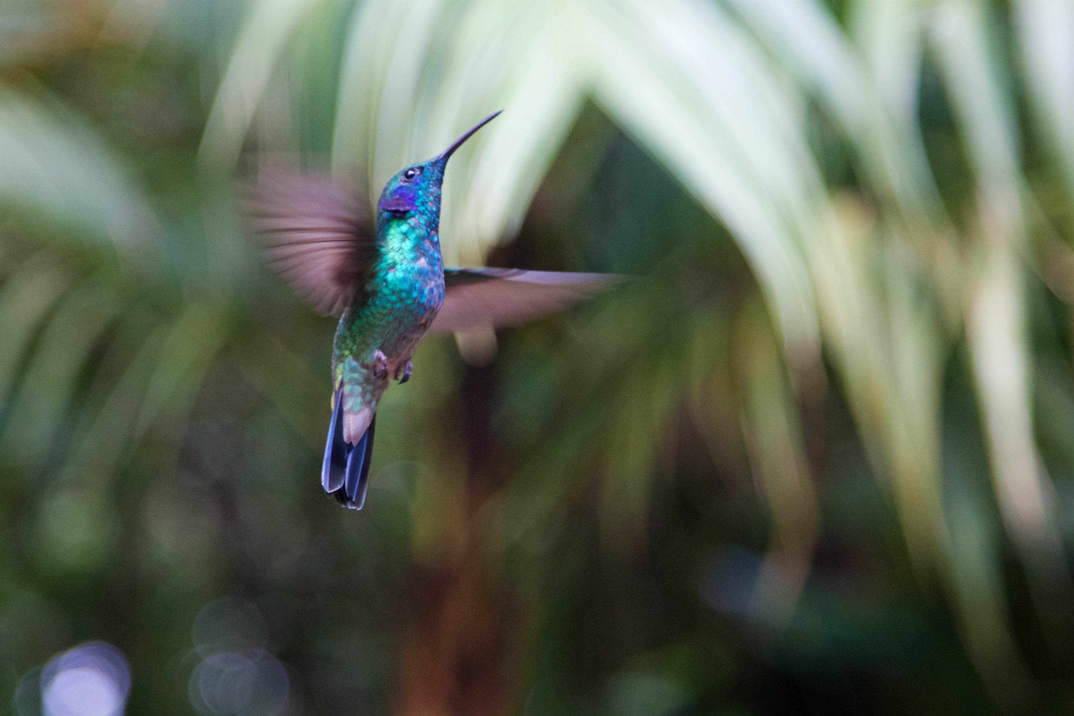 Nach unserer Hängebrückentour beschließen wir, noch das Cafe Kolibri zu besuchen. Hier tummeln sich aufgrund der vielen bei Kolibris beliebten Sträucher und zugegebenermaßen auch einiger Futterstellen mit Sirup mehrere dutzend Kolibris. Wir haben auch schon viele in der Wildnis gesehen. Man hört sie meistens, bevor man sie sieht. Das Brummen ihrer extrem schnellen Flügelschläge hört sich an, als wenn man ein dickes Gummiband schnell zum schwingen bringt – nur lauter. Hier gibt es über 50 Kolibriarten. Die Flügel eines Kolibris schlagen 60 Mal pro Sekunde und der kleine Vogel kann Geschwindigkeiten bis 95 km/h erreichen. Fotografieren lassen sich die Hektiker aber extrem schwer. Auch trotz der Futterstelle wird das extrem schwierig, aber Simona macht mit viel Geduld ein wunderschönes Kolibri Foto. Sie ist sehr stolz. Gegen halb zwei fängt es wieder an zu schütten wie aus Eimern.