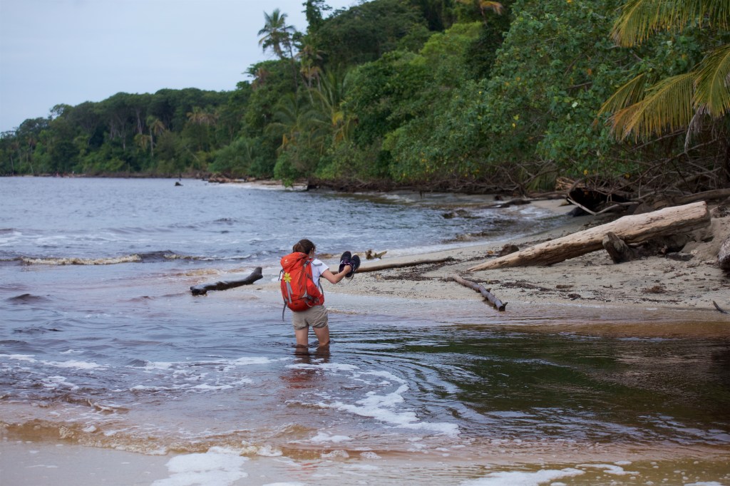 Als der Regen mittags nachlässt und schließlich ganz aufhört, machen wir uns auf den Weg in den 20km entfernten Cahuita Nationalpark. Schon am Eingang werden wir von Brüllaffen begrüßt, die uns von den Bäumen aus mit Früchten bewerfen. Ein Affe hat auch ein Baby dabei. Auf dem Weg durch den Park muss ein Fluss durchwatet werden. Das Wasser geht etwa bis zur Hüfte. Wir fragen uns, ob wir es besorgniserregend finden sollen, dass man kurz vor besagtem Fluss mal wieder ein Schild aufgestellt hat, dass man die Krokodile doch bitte wirklich nicht füttern soll. Wir kommen zum Glück mit vollständigen Armen und Beinen am anderen Ufer an. Auf dem weiteren Weg sehen wir noch einen Waschbär und einige schöne Schmetterlinge, aber leider kein Faultier. Wir fragen den vorbeilaufenden Ranger, ob es hier Faultiere gibt. Er antwortet: In fast jedem Baum eins. Er schaut nach oben in die Bäume und zeigt uns gleich zwei. Und eine Schlange am Boden. Wir sind beeindruckt. Wir haben gefühlt eine Stunde lang während der kleinen Wanderung nach oben gestarrt und kein Faultier gefunden. Jetzt sind wir angefixt. Auf dem Weg zurück findet Super-Animal-Spotter Flo gleich 4 Faultiere, Simona spürt immerhin auch eins auf. Wenn sie schlafen, sieht man nur ein kleines im Baum hängendes Wollknäuel, was sich schlecht gegen die Umgebung abhebt. Tarnung ist eben alles, das haben wir hier schon mehrfach festgestellt. Wir werden zum Top-Faultier-Spotter im Park und zeigen unsere Funde jedem, der noch so vorbeikommt. Alle sind total aufgeregt, weil sie – wie wir vorher – auch noch kein Faultier gefunden haben. Leider macht der Park schon um vier Uhr zu, sodass wir beschließen, am nächsten Tag nochmal wieder zu kommen. Der Ranger prophezeit uns: No rain in the night, no rain the next day. Na ob das mal stimmt.