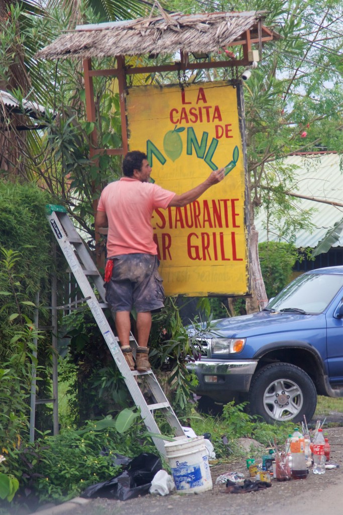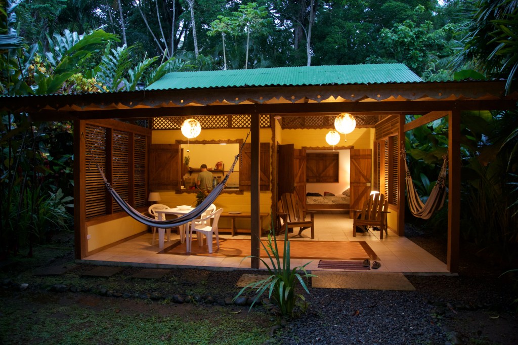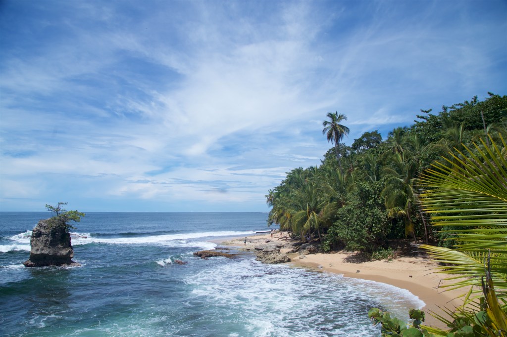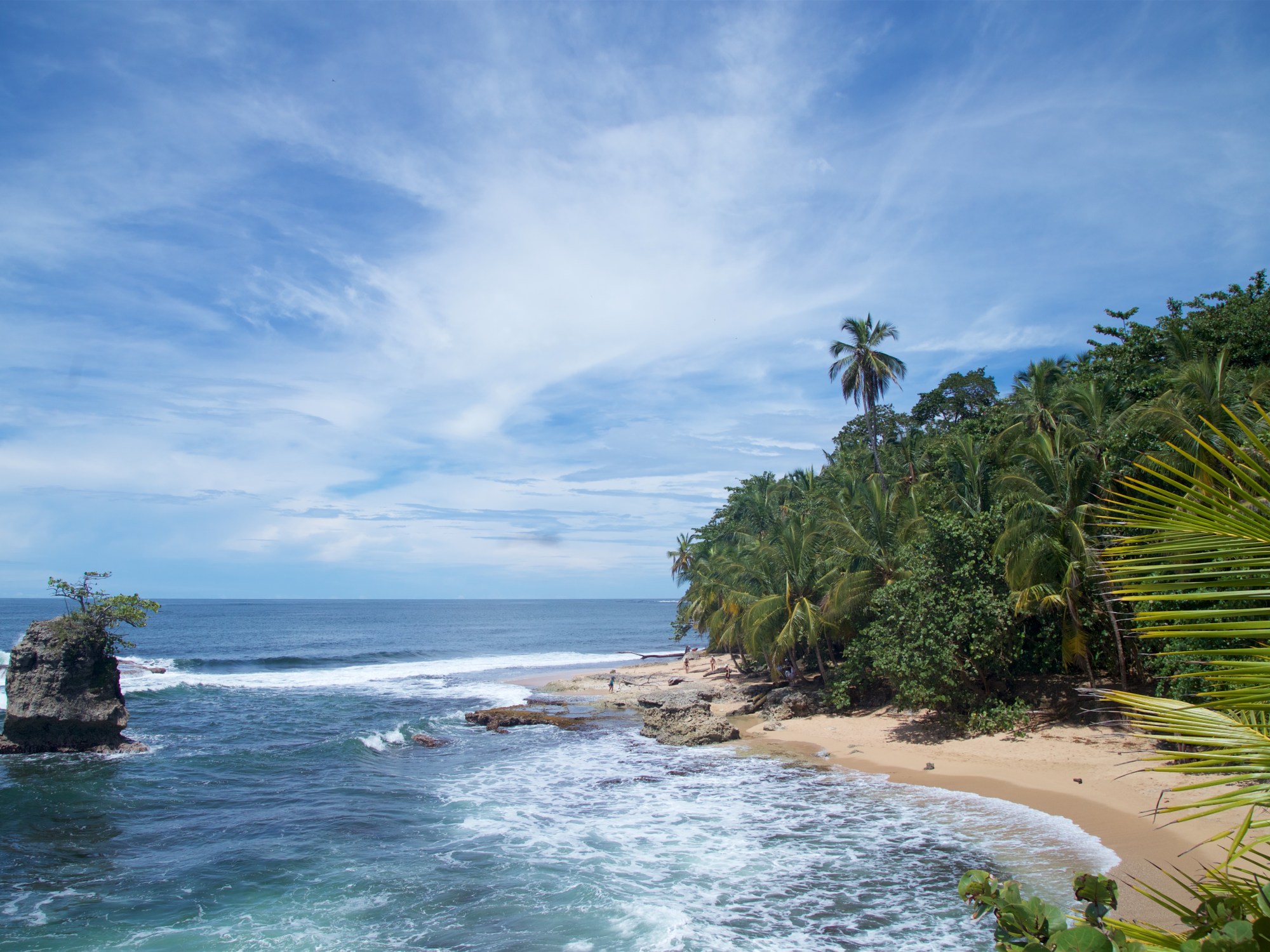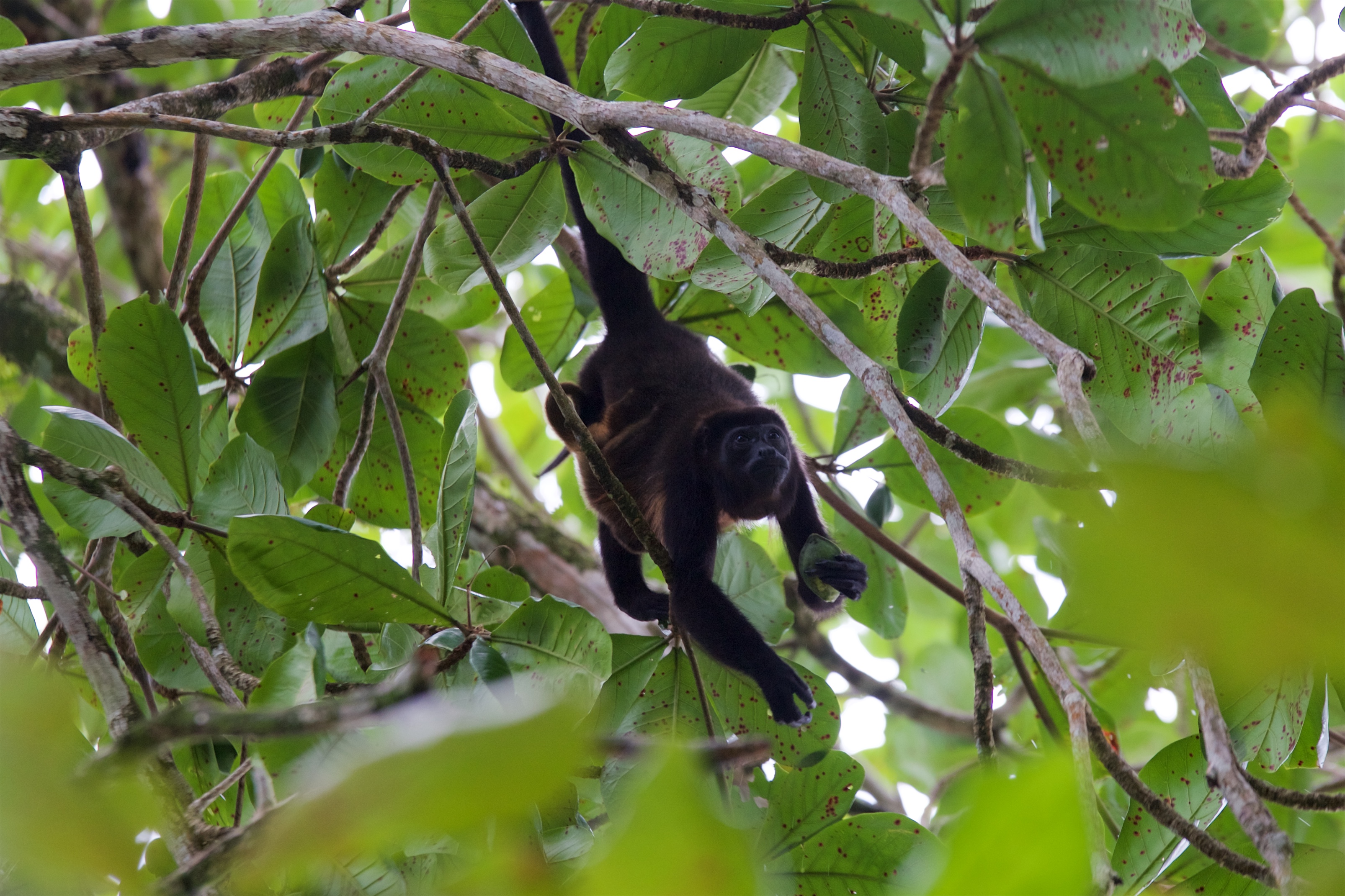 Am nächsten Tag machen wir uns auf den Weg an die Karibikküste. Es ist ein eher grau-regnerischer Tag und eignet sich daher hervorragend für eine längere Fahrt. Es wird mit 5-6 Stunden die längste unserer Reise werden – dachten wir. Während der ersten Stunde säumen endlose Bananenplantagen und Ananasfelder den Weg. Simona dachte bisher immer, Ananas wachsen auf Bäumen. Während der nächsten zweieinhalb Stunden fokussiert sich die Aussicht eher auf den Export der eben genannten Güter. Massenhaft Trucks in amerikanischem Stil verstopfen die endlose Baustelle von etwa 80-100 km. Wir fragen uns, wie man bei 5 Millionen Einwohnern so viele Bauarbeiter findet, um eine 80km lange Baustelle zu betreiben. Aber so langsam geht sie wahrscheinlich auch voran. Am Straßenrand sieht man haufenweise Hochseecontainer und sehr trostlose Häuschen oder Hütten, die den im Vergleich zu uns doch oft recht niedrigen Lebensstandard der Allgemeinbevölkerung hier widerspiegeln. Simona verbringt die Fahrt damit, ihre 32 Ameisenbisse an den Füßen mit BiteAway und Fenistil zu behandeln. Sie hat während der Froschfotoaktion versehentlich in einer Ameisenautobahn gestanden und die Ameisen fanden die kurzfristige Straßensperrung gar nicht witzig. Bisse von Blattschneiderameisen tuen erst tierisch weh und jucken dann entsetzlich. Flo macht sich die gesamte Autofahrt darüber lustig, dass die einzige in unserer Reisegruppe, die einen Doktortitel hat, als einzige bereits mehrfach in einer Ameisenstraße stand. Nach der Hafenstadt Puerto Limon ändert sich das Bild, denn wir haben die Karibikküste jetzt endlich erreicht. Jetzt richtet sich der Blick auf den Atlanik und palmengesäumte Strände. Wir sind einen Tag früher hier als geplant und haben daher eine Einzelnacht in einem Cottage am Playa Cocles bei Puerto Viejo, 500m vom Strand entfernt, gebucht. Das Häuschen ist sehr süß, hat aber auch so einige Nachteile. Es ist seeeeehr offen gestaltet, sodass Mensch und Tier quasi Tag und Nacht plötzlich im Schlafzimmer oder in der Küche stehen können. Mückengitter gibt es leider keine, dafür zwei aggressive Hunde und das Haus liegt etwas dunkel im Wald. Dafür hat man Dschungelfeeling pur. Nach kurzer Überlegung beschließen wir, nach der ersten Nacht noch einmal umzuziehen, da wir weitere vier Nächte hier verbringen wollen. Wir finden eine wunderschöne und ruhig gelegene kleine Anlage mit vier Häuschen und einem Pool in der Mitte ca. 1km entfernt. Der Besitzer der „Alloro Jungle Villas“ ist Italiener und kann nur Italienisch oder spanisch. Kein Englisch. Nach zwei Sätzen verstehen Simona und Flo nur noch spanisch und wir verständigen uns mit Händen und Füßen. Wenn es etwas komplizierter wird, kommt der Google Translator zur Hilfe. Wir laden unser Gepäck an der neuen Unterkunft ab, bevor wir zu unserem heutigen Ausflug starten. Man soll hier möglichst nichts im Auto lassen, da es vor allem in dichter besiedelten Gebieten schonmal vorkommt, dass die Sachen im Auto Beine bekommen, auch wenn das Auto verschlossen wird. Nachdem wir dem armen Italiener sein ganzen Büro vollgestopft haben, starten wir zu unserer Tour im 10km entfernten Gandoca-Manzanillo Nationalpark. Mittlerweile scheint die Sonne und die palmengesäumten Strände sehen aus wie auf einer Postkarte. In den Bäumen tummeln sich Brüllaffen, die wir mit ihrem typischen Affengeschrei zwar schon oft gehört, aber noch nie gesehen haben. Sie machen ein tiefes, vor allem in den Morgenstunden sehr lautes „huhuhuhuhu“, das durch den ganzen Wald hallt. Zusammen mit drölfzig verschiedenen Vögeln, die um die Wette zwitschern und kreischen, kann einen das schonmal wecken, bevor die Sonne richtig aufgegangen ist. Dann denkt man manchmal kurz: Kann jemand vielleicht mal kurz den Dschungel ausschalten?