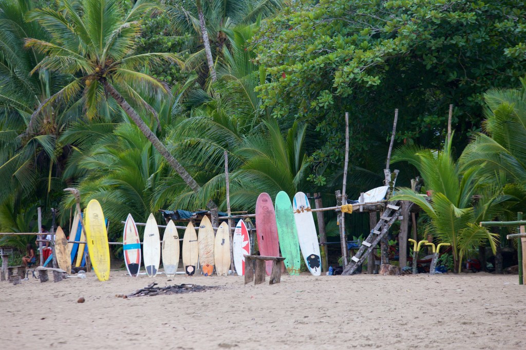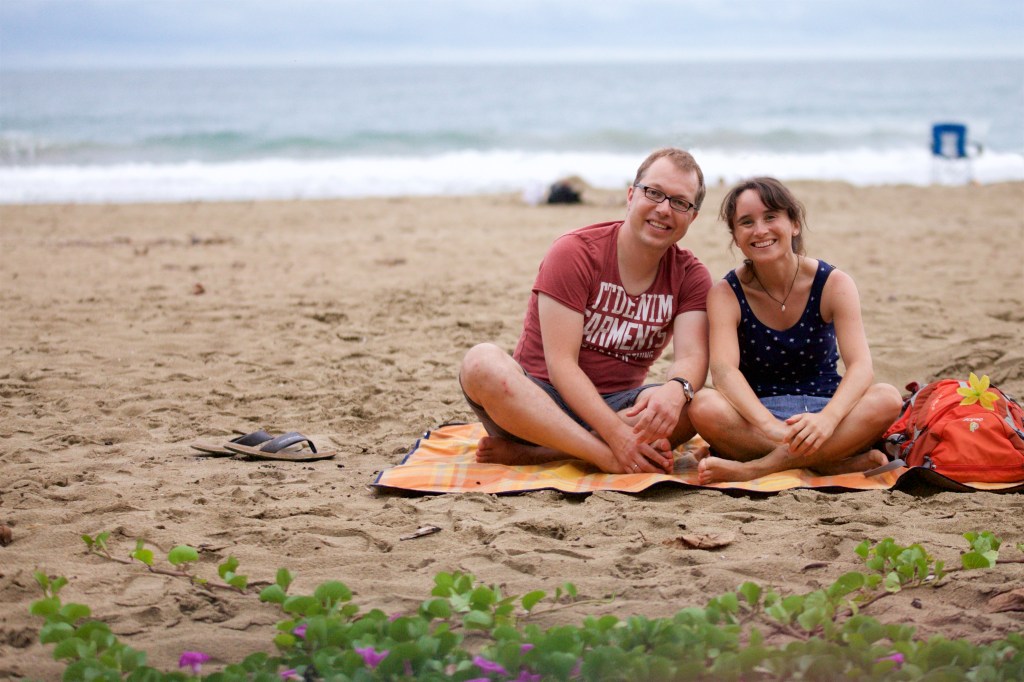 Nach der Tour chillen wir noch ein bisschen am Strand. Hier ist mit standardmäßig laufender Reggae-Musik, einigen Surfern sowie entspannten Strandcafes der Chillmodus quasi schon angeschaltet, bevor man sich richtig am Strand niedergelassen hat. Sämtliche Lieder, die man so kennt, werden ausschließlich nur im Reggae-Mix gespielt. Und das fünfmal hintereinander. Aber man merkt auch nicht wirklich einen Unterschied, wenn es ein anderes Lied ist. Da es heute bewölkt ist, ist die Standortsuche etwas einfacher. Flos Sicherheitscheck, ob wir uns unter einer möglicherweise bald herabfallenden Kokusnuss befinden, entfällt, da wir keine schattenspendende Palme brauchen. Bleibt nur noch der Ameisencheck, der gemütlicher-Sitzplatz-Check und der schöne-Aussicht-Check. Das ist schnell erledigt und so können wir im eingeschalteten Chillmodus den Tag am Strand ausklingen lassen.