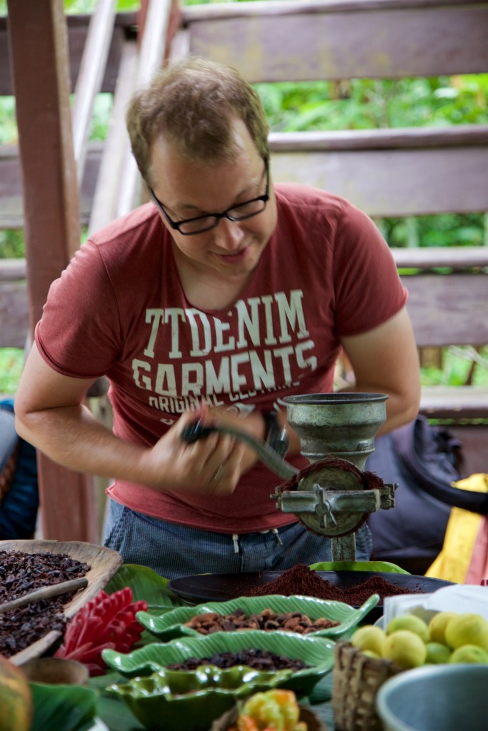 Am nächsten Tag ist es bewölkt und regnet morgens auch ein bisschen, sodass wir beschließen, den Tag entspannt angehen zu lassen, gemütlich zu frühstücken (exotischer Obstteller können wir mittlerweile auch selbst :-)) und eine Schokoladentour zu machen. Pünktlich zum Start der Tour um halb zwölf hört es auch netterweise auf, zu regnen und bleibt den Rest des Tages trocken. Wir lernen viel über verschiedene tropische Pflanzen und Früchte und natürlich über die Schokoladenherstellung. Zur Begrüßung bekommen wir jeder eine Banane, die wir direkt von der Staude ernten. Es ist die beste Banane, die wir je gegessen haben. Auch Ananas werden uns in Deutschland wahrscheinlich nicht mehr schmecken, weil sie einfach ein unglaubliches Aroma haben, wenn sie nicht schon 6 Wochen auf den Weltmeeren unterwegs waren. Am Ende machen wir selbst unsere Schokolade und dürfen sie natürlich auch direkt probieren. Sie schmeckt extrem gut. Normalerweise schläft Struppel ja immer, aber wenn es um Schokolade geht, ist er hellwach.