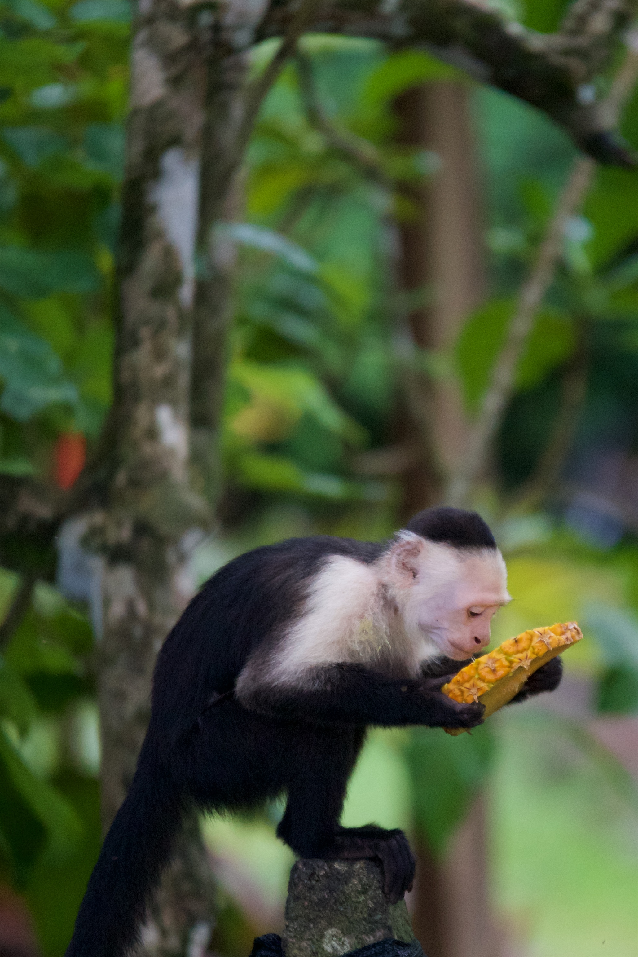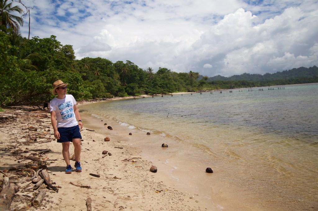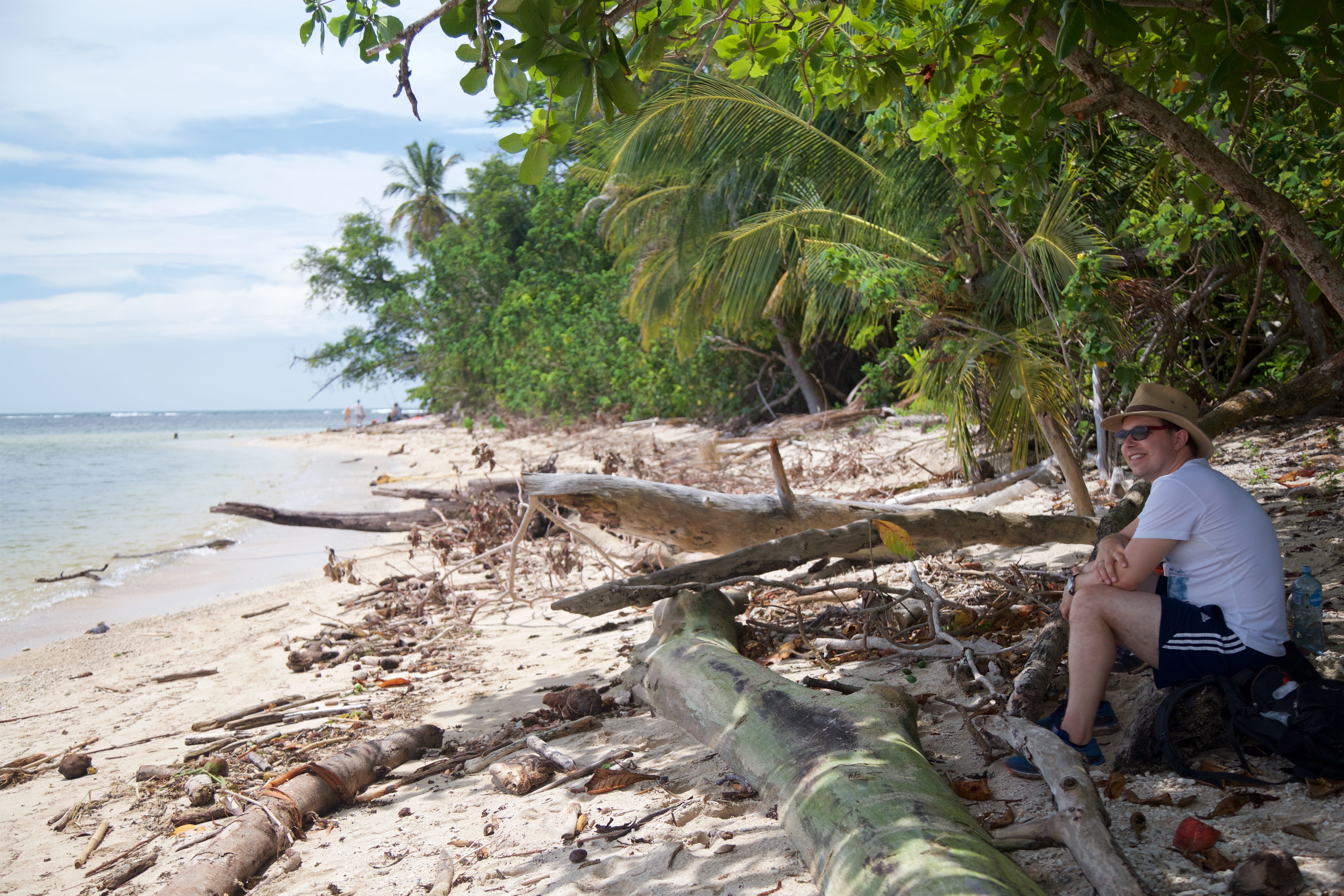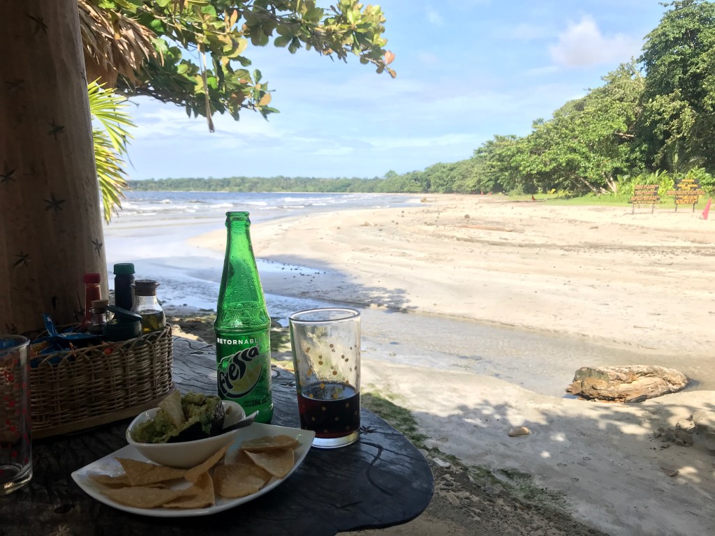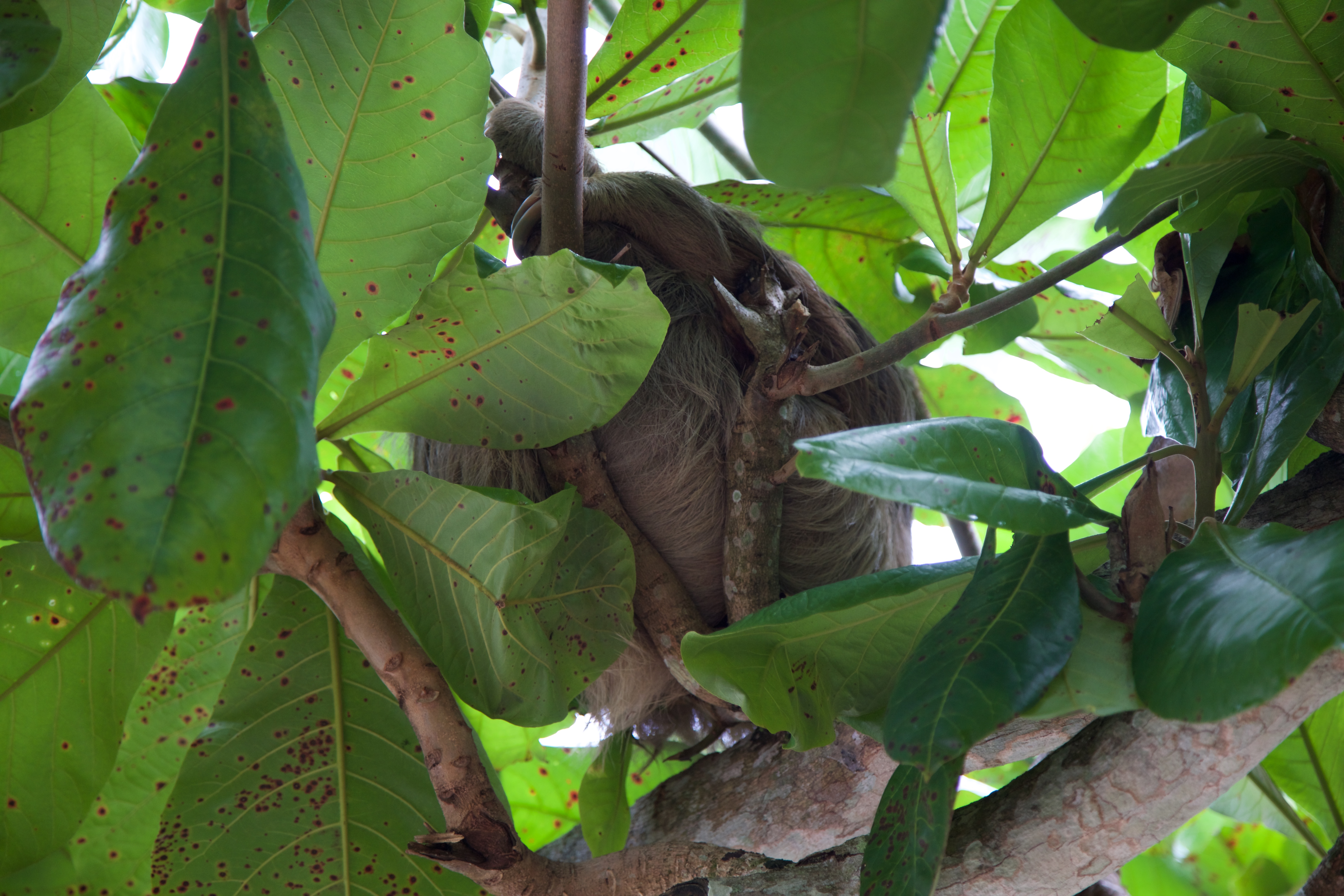 Natürlich hatte der Ranger wieder recht und nach einer regenfreien Nacht lacht die Sonne vom Himmel. Wir sind schon gegen 9 Uhr im Cahuita Nationalpark und starten die wunderschöne Wanderung immer entlang der Küste aber trotzdem im Regenwald, sodass wir alles vereint haben: Blick auf das Meer, schattenspendender Wald und Möglichkeit zur Tiersichtung. Schon hundert Meter vom Parkeingang entfernt hat Simona das erste Faultier gesichtet. Die Übung vom Vortag trägt also Früchte. Wir finden noch einige mehr und auf dem weiteren Weg läuft uns noch ein Nasenbär über den Weg. Als wir nach 3,5km am „Punta Cahuita“ ankommen, sind wir ziemlich geschafft. Bei 30 Grad und 85% Luftfeuchtigkeit fühlen sich 3,5km an wie 20km. Der Küstenzipfel mit Strand, sehr klarem Wasser und Palmen eignet sich daher hervorragend für eine Mittagspause mit Snack und einem kleinen Bad im Meer. Nachdem wir die 3,5km wieder zurück gegangen sind, brauchen wir wieder dringend eine Pause und beschließen daher, in einem Strandcafe einen Sundowner zu trinken und Nachos mit Guacamole zu essen. Auf den Salz- und Flüssigkeitshaushalt sollte man ja immer achten. Neben uns turnt ein Faultier im Baum herum. Die an der Karibikküste vorgerrschenden Zweifingerfaultiere sind im Gegensatz zu den Dreifingerfaultieren (s. erster Blogartikel) vorrangig abends und nachts aktiv. Deshalb sieht man sie meistens nur als Knäuel faul in einer Astgabel hängen. Daher auch der extrem passende Name. Auf englisch heißt das Tier aber ganz langweilig „Sloth“.